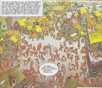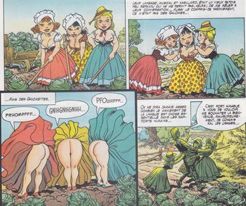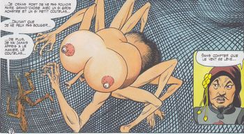 remarques: | les aventures de la grande godemiche bêta Jean-du-creux-de-la-vieille-tour-du-fond- du-vallon-vert dit Jean de Beauvallon et du chevalier nabot Krucheboll à Krokebouh, capital des ghlomes, Krucheboll est accusé de klakebander le harem du roi, celui-ci ne peut plus faire taire son harem parce qu'il a épuisé la bouteille de liqueur de puissance, l'autorité du roi est donc contestée le conseil du grand livre des dykktates condamne alors Krucheboll à rechercher à travers le monde une autre bouteille de liqueur de puissance et après avoir fait ses adieux à sa bonne, douce et tendre Erglandine, accompagné du fouty glandailleur Jean de Beauvallon, Krucheboll se met en route avec la jument mademoiselle Bellecroupe et l'âne monsieur Griboron >> p. 6 rencontre avec les ghlomettes qui saluent les voyageurs en montrant leurs khuls rencontre avec la fée Balbue, marraine de Krucheboll qui leur apprend que le flacon de liqueur de puissance serait caché dans la montagne interdite, elle leur fait cadeau d'une besache en peau de fée (qui fournit de l'eau quand on y met le doigt) et d'une carte mouvante. >> p. 30 la fée Balbue >> p. 37 arrivée dans l'outre-monde à la forteresse noire >> p. 44 sauvé de l'araignée érotique par le vent des sables >> un bon graphisme et un scénario heroico-fantasy erotico-humoristique d'assez bonne allure, du moins tiré d'une idée originale avec un vocabulaire littéraire peu usuel et les deux compères peuvent être comparés à Don Quichotte et Sancho Pença mais à rôle inversé Information Chroniques du temps de la vallée des Ghlomes est une série de bande dessinée, créée par le scénariste Christian Godard et le dessinateur Julio Ribera en 1985, quatre volumes en ont été publiées de 1985 à 1996 par divers éditeurs, le troisième a été dessiné par Florenci Clavé |