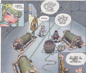 remarques: | dans le désert de l'outre-monde où la besache rend bien service, rencontre avec l'ermite des sables Jean de Beauvallon et Krucheboll sont transformés en cailloux, puis avalés par la truche et sauvés par Morgane-Marie après que la truche ait pondu ses cailloux >> p. 10 l'allusion en dernière vignette est parfaite arrivée à Lychemoth, capitale du royaume des sables où nos deux amis sont emprisonnés par les soldats-pilons, puis leurs medius sont présentés au harem du roi et à la reine Khunegonce, enfin livrés au sérail de la reine de Lychemoth pour utilisation de leurs medius (surtout celui de Jean de Beauvallon) >> p. 20 les ghlomettes (sic) qui savent bien turlupiner les medius des mâles avec leur "bon oeil" >> p. 29 un harem composé de mâles >> p. 30 la reine Khunégonce >> p. 32 à 34 l'histoire des soldats-pilons (plus jamais ne pliera) qui se livrent bataille en se tranchant les pilons = la guerre des pilons, les deux armées qui se battent: l'une à la dextre, l'autre à la senestre Morgane-Marie aidera nos deux amis à s'enfuir avec des cerfs-voltigeants, après que Jean de Beauvallon ait réussit à s'emparer du flacon de cuissance (puissance), mais celui-ci se brisera lors du vol et la quête devra continuer >> p. 43 Krucheboll a fort petites jambes, mais grande célébrité à les faire se croisillonner >> des aventures comiques, mais aussi érotiques qui restent toujours encore amusantes |