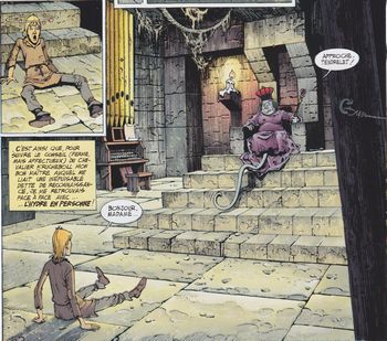 remarques: | nota bene, la maison d'édition n'est plus Dargaud mais Vaisseau d'Argent on arrive dans un champ de ghlodemiches avec les petits khuls des ghlomettes = les ovules et avec un troupeau de cornouillers = serpents-éclairs = les spermatozoïdes puis on arrive dans la forêt eskouadoriale avec le pêcheur de ghlouilles qui leur indique les canaux à suivre pour leur prochaine destination, lutte avec les pirates et sauvés par un diablodokus mordoré = = dragon géant, mais la besache leur est dérobée finalement le duo arrive à Hydramabad, gouvernée par l'hydre mélomane, cité du chant et de la musique où il n'y a rien de bon à manger (sauf les mag-dho = pâté flou dégoûtant) et c'est dans les katakombles qu'on déguste les bons mets >> p. 32 la cuisine des kataklombes suite à une inondation, nos deux amis se retrouvent au dehors des kataklombes et paraissent devant l'hydre mélamone on leur soumet l'épreuve des sept filles siamoises qui si elles sont satisfaites chantent les sept en même temps et ce sera Jean de Beauvallon qui grâce à son super medius gagnera l'épreuve alors que Krucheboll se fait jeter en prison après avoir essayé de dérober un flacon de puissance >> p. 44 la terrible hydre mélomane >> p. 46 les 7 joyeuses dévergondées siamoises à la tignasse débordante >> le graphisme reste toujours de bonne fracture, mais le scénario commence à montrer des signes de fatigue alors que la quête n'est toujours pas terminée n.b. la couverture de l'album ne correspond pas au contenu de l'album |