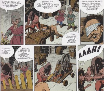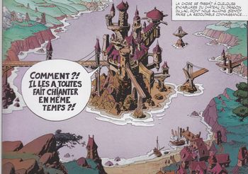remarques: | nouvelle maison d'édition: Soleil pour ce dernier album de la série et après une pause de six années, les aventures de Jean de Beauvallon et du chevalier Krucheboll continuent tandis que le fouty glandaillon (Jean) se délasse avec les sept soeurs siamoises, Krucheboll est mis à la torture pour avoir dérobé le flacon de puissance >> p. 9 une position peu commode entretemps, le seigneur voisin du château du dragon du lac, qui a des prétentions sur Hydramabad et qui est tombé en possession de la besache en peau de fée (qui pisse de l'eau quand on y met le doigt), entreprend de délivrer Jean de Beauvallon et Krucheboll afin que celui-ci demande l'aide de sa marraine la fée Balbue pour s'emparer du royaume de l'hydre mélomane >> p. 16 le seigneur du château du dragon du lac = genre Guillaume II de Prusse finalement après avoir réussi à se débarrasser du seigneur du lac grâce à la fée Balbue, nos deux amis reprennent la route avec leurs deux coursiers, mais Krucheboll s'aperçoit que le flacon ne contient pas la liqueur de puissance mais une autre liqueur, tout est à recommencer et la quête continue >> p. 28 retrouvailles avec Mademoiselle Bellecroupe (la jument) et monsieur Griboron (l'âne) >> la suite toujours aussi farfelue et cocasse avec un langage turlupineux, coquecouillet et kakatoire des chroniques du temps, mais on commence à se lasser de ces aventures qui deviennent quelque peu monotones dans ce dernier album tel l'épisode p. 31 à 37 avec l'ambassadeur-pédé du seigneur du dragon du lac n.b. et la suite annoncée en fin d'album (sans titre) ne verra plus le jour |