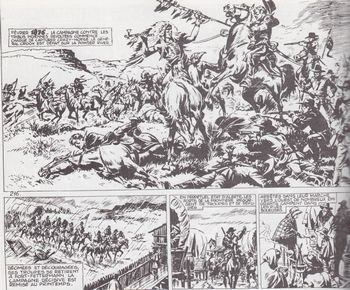 remarques: | préface: les dessinateurs ayant surtout travaillé avec Marijac: Duteurtre dit Dut et Mathelot, les oeuvres de Dut: guerre à la terre et Sitting Bull dans Coq Hardi, puis Dut continuera à dessiner des BD romantiques et historiques dans "Mireille" et "Frimousse" premier épisode: Tucson à Tucson, Bill Hickock enquête sur un trafic d'armes avec les peaux-rogues, mort de Bill Hickock tué d'une balle dans le dos par un complice de Latimer >> p. 27 la mort des assassins de Bill Hickock vengé par Sitting Bull apparition du vieux trappeur Jim Bridger qui critique le massacre des bisons provoqué par des politiciens véreux, Bridger en parle à Buffalo Bill qui défend les peaux-rouges à Washington, entretemps la bande de Latimer est capturée par Sitting Bull >> p. 64/65 l'épreuve du mustang pour Latimer qui meurt malgré tout écrasé par les bisons qu'il pourchassait deuxième épisode: 1876 deux jeunes immigrants errent dans la prairie et rencontrent Jim Bridger et le jeune outlaw Clay Allison, dit le "Kid" sur la route de Fort Fetterman, le "Kid" renie sa vie d'outlaw et accepte de guider les deux jeunes gens vers Sacramento alors que les sioux de Sitting Bull s'établissent à Little Big Horn dans les Black Hills, suite à l'arrivée de prospecteurs d'or sur leurs terres, les sioux se révoltent en février 1876, le général Crook est battu par Crazy Horse sur la "Powder River", Custer organise une expédition punitive, mais suite au rassemblement des tribus indiennes, il subit une lourde défaite à la bataille de "Little Big Horn" le 25.6.1876 >> p. 85 le campement indien qui s'étend sur vingt mètres (km) >> p. 95 la réflexion de Buffalo Bill concernant les indiens qui sont mieux protégés au Canada (la reine Victoria ayant des vues plus humaines et plus justes envers ses sujets indiens que les américains qui les considèrent comme des sauvages) entretemps, Buffalo Bill soumet les cheyenne en tuant leur chef Main Jaune dans un duel loyal, la victoire des sioux étant sans lendemain, Sitting Bull emmène sa tribu vers le Canada >> 104 le duel entre Buffalo Bill et Yellow Hand >> 106 le sacrifice du petit clairon Jack pour sauver les guerriers de Sitting Bull menacés par une mitrailleuse à River City, Jimmy Ringo accepte le job de chasseur de prime sur Sitting Bull, mais impressionné par le courage et la droiture de Sitting Bull, il y renonce et le défendra même contre les frères Thorp qui se sont aussi lancés à la poursuite du chef indien, Ringo sera tué dans une embuscade des Thorp alors que Sitting Bull visite ses frères restés aux USA qui sont frappés de la variole, finalement, Sitting Bull accepte de se soumettre après que Crazy Horse ait été tué, Spotted Tail emprisonné et Red Cloud confiné dans la réserve de Pine Ridge, le peuple indien aura cessé d'exister comme nation >> p. 129 la mort du vieux chef indien "pluie d'orage" >> p. 140 la mort de Jimmy Ringo >> deuxième volet de la fresque historique sur Sitting Bull, le scénario se répète quelque peu mais reste toujours intéressant; le graphisme est toutefois un peu moins bien élaboré, surtout en dernière partie, de l'album sauf pour la partie concernant les dernières grandes batailles indiennes (pages 79 à 106) où les dessins représentent bien le style de Duteurtre |