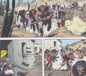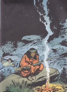 remarques: | album tome no 4 faisant partie de la collection Jerry Spring, le premier étant golden creek (1988), le 2ème Yucca ranch (1988) et le 3ème lune d'argent (1987) n.b. les albums de cette collection n'ont pas été réédités par année de parution, le premier ayant été le tome 16, la fille du canyon, paru en 1977 cet épisode fait partie du tome 3 N&B collection grand format trafic d'armes (réédition 1987) révolution au Mexique, Jerry y est envoyé comme reporter d'un journal de New York. >> p. 5 l'hôtel est complet, mais il va peut'être y avoir de la place Jerry s'engage à convoyer une livraison de machines à coudre pour Chihuahua mais arrêté par les "rurales", les machines à coudre s'avèrent être des fusils pour les révolutionnaires, Jerry est condamné à être fusillé par les rurales, puis délivré par les révolutionnaires et condamné par eux d'être à nouveau fusillé, il sera délivré par Pancho qui fait partie des révolutionnaires par la suite, une bande d'apaches attaquent le pueblo pour s'emparer des armes, Jerry et Pancho capturés sont délivrés par leur ami apache "seule flèche" qui les conduit en sécurité sur la montagne sacrée >> p. 37 la montagne sacrée Jerry et Pancho retourneront à Chihuahua et démasqueront le chef des trafiquants qui n'est autre que le gouverneur et son secrétaire, poursuivis par les rurales, nos deux amis seront à nouveau sauvés par les apaches de "seule flèche" >> le scénario de cet album n'est pas des plus recherché (sauf pour les machines à coudre) mais un superbe graphisme avec une jolie planche de Jijé en fin d'album |