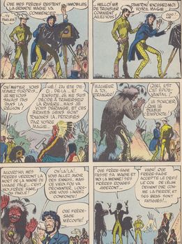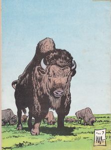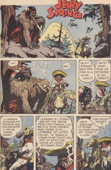 remarques: | un des premiers épisodes de Jerry Spring rencontre de Pancho avec l'indien Kiowa qui lui apprend le passage du "trader au visage calme" (= Jerry Spring) qui joue le marchand chez les indiens lors du marchandage, Tête Folle chef Kiowa, veut acquérir à tout prix le cheval de Jerry, celui-ci refuse et est attaché au poteau de torture, mais Pancho réussira à le délivrer et la quête continue, Jerry expliquant à Pancho qu'il est à la recherche d'une jeune femme blanche enlevée par les Dakotas ainsi que du maître-chanteur le photographe, Jim Dawton surnommé Jimmy Longues-Jambes >> p. 12 Jerry blesse un bison pour exciter le troupeau contre les Kiowas qui les poursuivent >> p. 17 rencontre avec un groupe de pillards crows >> p. 22 Tête Folle qui devient Tête Sage >> p. 30 Jerry vendant sa camelote aux Dakotas rencontre avec Jimmy à qui nos deux amis joueront un bon tour, puis par ruse Jerry et Pancho réussiront à faire évader lune d'argent = la jeune femme blanche Daphne Elliott >> un superbe album, un des meilleurs albums de la série surtout pour le graphisme en couleur n.b. l'album présenté ici est qualifié BE+ à cause de petites traces de scotch sur la couverture et sur les pages de garde, mais l'intérieur est impeccable valeur BDM Euros 100.- à l'état BE |
