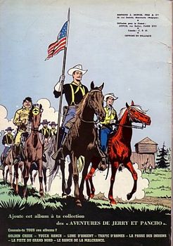 remarques: | Fort Juniper dans le nord des USA où Jerry et Pancho viennent d'arriver en mission, il y a des problèmes avec les indiens "Loucheux" qui assiègent Fort Redstone à 120 miles plus au nord, Jerry et Pancho avec le trappeur "la Ballue" partent en canoe pour essayer de négocier avec les indiens >> p. 4 trafic d'armes, d'alcool et de fourrure >> p. 8 on prend un café très fort avant d'aller dormir démêlés avec les "loucheux" autour de Fort Redstone, la garnison décide de quitter le fort dans l'obscurité, poursuite et démêlés avec les indiens >> p. 16 un groupe de poney indiens sans gardien? finalement tous réussiront à échapper aux "loucheux" et Jerry découvre la trahison involontaire de la Ballue qui fournissait aux indiens des armes dérobées à l'armée par l'entremise du commerçant Meadows qui faisait chanter La Ballue, le fils de celui-ci étant prisonnier des "loucheux" à la solde de Meadows >> p. 36 Ruby est devenu un vrai combattant >> p. 45 la "juste" justice de Jerry Spring >> un album respectable tant pour le graphisme que pour le scénario |