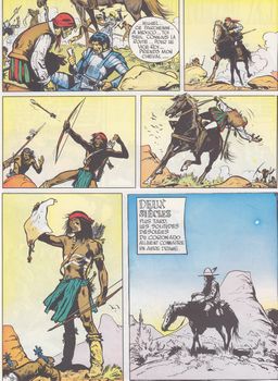 remarques: | graphisme en partie par Giraud (page 27?) le drame des conquistadors attaqués par les Yaquis en 1672 dans le canyon de Coronado Jerry et Pancho en vadrouille découvre le corps d'un vieil indien yaqui, Petit-Cactus, chef des yaquis veut venger la mort de son père, le mystère du vieux parchemin, démêlés avec les yaquis, arrestation du meurtrier du vieil indien = Silver, un yaqui qui ayant étudié chez les blancs a pu lire le vieux parchemin >> p. 20/21 Pancho s'habille de neuf (veston en tissu rose et superbes bottes mode texane) >> p. 27 l'attaque des Yaquis sur les ranchs du Coronado l'enquête de Jerry piétine mais l'arrivée de l'archéologue Jeroboam Moorhouse et de sa fille Judith dans la vallée de Coronado permettra à Jerry de découvrir le mystère du vieux parchemin, il s'agit du trésor des incas qui sera la récompense de tous les efforts après que le fauteur de troubles, Silver le Yaqui, ait été éliminé par les Yaquis eux-mêmes >> ce n'est pas encore le Pérou pour les Yaquis, graphisme et scenario toujours en baisse (genre tragico-comico) mais encore acceptables |