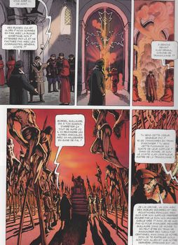 remarques: | 7ème volet: 1914 1ère guerre mondiale, la Somme, Venise, Ypres, apparition de Adolf Hitler qui sera récupéré par Guillaume de Lecce, le 5ème archonte, l'ange exterminateur thème principal: les origines de la première guerre mondiale 1815, défaite de Napoléon qui a joué sa dernière carte (celle du sphinx) et qui a perdu 1914, 99 ans après, le monde s'ouvre à la science et à la technique, mais aussi à la guerre, Dyo et ses alliés rouges mènent une guerre de l'ombre dont l'attentat de Sarajevo alors que les clans des épées, des deniers et des bâtons se rendent compte qu'il faut qu'ils s'unissent pour ne pas laisser le monde disparaître >> p. 7 le dragon rouge à l'assaut d'un aéroplane français est arrêté par les archers de Crécy, les archers d'Erlin, ceux-là même qui arrêtent les uhlans au pont de Nimy >> page 10 >> p. 12 les premiers bombardiers de l'époque dont le fuselage est peint par Marc Chagall Erlin et Aker sont unis (alliance franco-anglaise), sur le front, Erlin rend visite au Kriegsmaster Dyo pour lui faire comprendre que les familles sont maintenant menacés par un 5ème archonte: Guillaume de Lecce, l'ange exterminateur durant l'entretien, Erlin réussit à neutraliser la force de Dyo et l'offensive allemande à l'ouest perd de sa vigueur, Aker conseille alors à Foch de passer à la contre-offensive sur la Marne tandis que alors que les moines rouges de Guillaume de Lecce préparent la révolution russe 1916 Venise, la comtesse Reka est prise à partie >> p. 28 la peinture magique qui protège les avions au Teutoburg, Dyo rencontre Herrschaft Guillaume qui se prend aussi pour Vlad, l'empaleur, maître de la Transylvanie 1918 Ypres, front de la Somme, Erlin confie au capitaine anglais Curtis le soin de réduire au silence le chef du 16ème bavarois, une compagnie de guerriers-loups d'origine norvégienne (bersek en norvégien veut dire guerrier-loup), c'est une mission délicate car l'action se situe dans une zone d'entropie (= dégradation d'un système) où se trouve une grande caverne surnommée la cathédrale noire = Notre-Dame des Ténèbres la mission ne réussira pas, le chef du 16ème bavarois n'étant que blessé, il sera récupéré par les frères rouges de Guillaume, cet homme, c'est le caporal Adolf Hitler >> à nouveau un récit désordonné et de non-sense mais avec quelques bonnes illustrations dont le dragon rouge, l'assaut des uhlans, Varus et ses légions, la comtesse Reka, les canaux de Venise et le tank Mark IV fin du premier cycle |