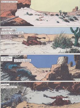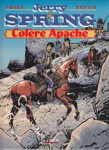remarques: | Tucson, Arizona Jerry Spring (qui ressemble maintenant beaucoup à Blueberry) délivre Yanozha, un indien chiricahua, qui est fouetté sur la place publique Jerry travaille maintenant avec le dénommé Sydney Carlton comme conseiller aux affaires indiennes alors que Pancho s'occupe de leur ranch >> p. 13 rencontre avec Sagozhuni, fille de Gadoa, chef chiricahua Sagozhuni deviendra le 2ème amour impossible de Jerry >> p. 15 Jerry organise, à la mode des blancs, la vie des chiricahuas dans leur réserve de San Carlos, mais il se heurte à l'hostilité de Brooks, maire de Tucson Jerry est battu à mort par les hommes de Brooks, mais sera sauvé par Sagozhuni et par Yanozha, entretemps, Brooks est assassiné et scalpé, Earl, son assistant, accuse les apaches et veut les éliminer >> p. 24 Brooks, un homme au drôle de comportement (les soldats-jouets) la 2ème partie voit l'affrontement entre blancs, chiricahuas et l'armée qui intervient pour faire régner l'ordre, les rebelles chiricahuas dirigés par Yanozha seront écrasés par l'armée (dans une bataille semblable à celle de Naddi-Chaddi >> voir l'histoire du Far West), mais auparavant les criminels blancs Sydney et Earl seront châtiés par les chiricahuas >> p. 50 le duel final et loyal entre Jerry et Yanozha, jaloux de Jerry à cause de Sagozhuni qui finalement restera avec Yanozha malgré son amour pour Jerry >> un assez bon début pour ce premier album dessiné par Franz, le graphisme est tout à fait à la hauteur avec un scénario plus réaliste et plus sinistre que celui de Jijé malgré l'aspect sentimental avec Sagozhuni, toutefois ce sera le premier et le dernier album de cette nouvelle collection Jerry Spring, éclipsée peut'être par la concurrence de la série Blueberry n.b. en plus des 21 albums collection Jerry Spring par Jijé et un album nouvelle collection Jerry Spring par Franz, il y eut encore les 4 albums grand format mais noir&blanc avec 2 épisodes chaque des aventures de Jerry Spring, dont les inédits tous réédités en couleur dans la collection Jerry Spring de 1984 à 1987 |