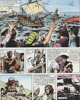 remarques: | il y a eu deux éditions par Helyode 1) tome 1 premier voyage (1992) 2) tome 2 la trahison (1993) tous deux redessinées partiellement par Lorg = fils de Jijé qui prend aussi le nom de Philip pour les scénarios, ce seront les deux seules éditions de Helyode sur Jijé, les autres oeuvres biographiques de Jijé seront éditées par Dupuis dans la collection "figures de proue" Prologue - récit du premier voyage de Colomb comme raconté dans sa lettre de 1492 adressée aux très hauts, très excellents et très puissants roi et reine des Espagnes et des Iles de la Mer, in nomine domini nostri Jhesu Christi - commentaires de l'éditeur Charles Dupuis qui considère Jijé comme un géant du 9ème art le récit de Colomb paru dans Spirou en 1942 et édité en un seul et unique album en 1946, le présent album est le premier album paru pour la réédition prévue des oeuvres biographiques de Jijé (mais qui ne sera pas continuée avec Hélyode) 1466, Constantinople est tombée, la route terrestre vers l'est est pratiquement coupée par les ottomans, on recherche maintenant une route maritime pour l'est en partant vers l'ouest à Gênes, Cristoforo, fils de Dominico Colombo, veut devenir marin, plus tard Colomb cherchera avec un géographe la possibilité (puisque la terre est ronde) de gagner les Indes par l'ouest trompé par le roi du Portugal, Colomb offre ses services aux rois d'Espagne (Ferdinand et Isabelle), après bien des discussions, Isabelle de Castille fait confiance à Colomb. Colomb quitte Palos en août 1492 avec 3 navires: Santa Maria, Nina et Pinta le 6.9. depuis les îles Canaries, il s'élance vers l'inconnu en suivant à peu près le 28ème parrallèle, on arrive d'abord à la mer d'herbe (les Sargasses), après plusieurs semaines sans avoir aperçu de terre, l'équipage se révolte et donne encore 3 jours à Colomb avant de retourner au pays (comment?) le 3ème jour, une terre se montre c'est Cuba, puis rencontre avec les terribles indiens caraïbes, enfin le continent américain (Colombie?) la Santa Maria et la Pinta perdues, Colomb repart avec la Nina le 4.1.1493 en laissant une garnison à Navidad sur l'île d'Hispaniola il y aura encore 3 voyages, mais la rencontre du vieux continent avec le nouveau aura eu lieu >>> p. 28 et 41 ainsi que la couverture d'album: la fameuse arrivée de Colomb sur le Nouveau Continent >> début des oeuvres biographiques de Jijé, le graphisme et coloriage sont encore assez faibles (surtout dans la réédition) mais le récit est bien raconté |
