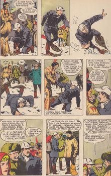 remarques: | dos rouge, édition belge d'après le roman de Jean Pirot, l'histoire de Jean Choumak d'origine allemande = Schuhmacher, émigrant de Hongrie pour les USA suite à une révolte paysanne en Hongrie, buveur de palinka (genièvre), puis de whisky mais l'alcool ne convient pas du tout à Jean Choumak arrivée avec sa jeune femme Borcza à Willowdale (Canada) chez le cousin Orosz Bela, contact avec le français Labelle et les peaux-rouges qui appellent Choumak blanc casque à cause de sa casquette blanche >> p. 15 la fameuse casquette blanche qui donne son surnom à Choumak >> p. 16 jamais un peau-rouge n'a manqué de respect à une femme blanche (?!) construction d'une maison familiale et naissance de la petite Mariska mais Choumak commence à devenir un ivrogne, altercations avec Borcza qui se sauve et sous l'emprise de l'alcool, Choumak jette sa fille dans la rivière Mariska est sauvée par une jeune squaw de la tribu indienne des "sauteurs" dont le chef est l'irascible Powassan = tête rêveuse, de son côté, Choumak est fait prisonnier par Nipapinese, chef de la tribu des "cris" et livré à la justice des blancs la robe noire (nommé yiski maskodepinig par les indiens) oblige Powassan à remettre Mariska aux blancs et Borcza retrouve sa Mariska >> p. 23 la robe noire = un missionnaire catholique d'origine belge >> p. 44 le méchant païen! Choumak va être jugé mais la robe noire intervient en sa faveur et il parvient à faire libérer Choumak sous serment avec peine de mort à ne plus boire d'alcool, Choumak se repent, se réconcilie avec Borcza et devient un brave père de famille >> p. 54+56 Choumak respecte son serment >> une aventure dans la lignée des Don Bosco, Foucauld et Emmanuel, et basée sur des faits réels selon le roman de J. Pirot, le récit est très moraliste et d'influence religieuse catholique belge (la robe noire) et même les peaux-rouges les plus irascibles finissent par devenir chrétiens prépublié dans le fascicule "le moustique" en 1954, Jijé déploie déjà tout son art en matière de graphisme et de coloriage et l'histoire très sentimentale est bien racontée valeur BDM en BE Euros 150.- (l'édition française pratiquement similaire est parue avant l'édition belge en 1956 et côte Euros 200.-) |