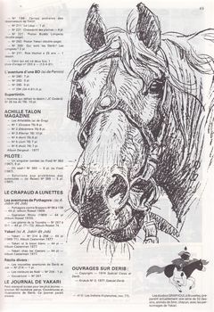 remarques: | Derib alias Claude de Ribaupierre, né en 1944, un des premiers dessinateurs suisses de BD 1) entretiens de Derib avec Claude Ecken en 1980 travaille d'abord au studio Peyo sur les "Schtroumpfs", devient plus tard un fanatique du western et des chevaux, une première bande publiée dans Spirou: Arnaud de Casteloup qui restera sans suite, travaille ensuite avec Rosy sur Attila, le chien, par la suite collabore en Suisse avec Job (= André Jobin) pour Pythagore et Yakari qui rend Derib bien connu dès 1972, parution de Buddy Longway avec Greg dans Tintin, une série qui anime le récit de vie d'une famille dont le héros vieillit au fil des aventures Derib aime beaucoup la nature, notamment la montagne, croit qu'il y a dans la vie des forces qu'on ne peut pas contrôler, s'intéresse aux OVNIS, deux albums parlant quelque peu de fantastique dans la série Buddy Longway: l'Orignal et le démon blanc les techniques de construction d'images propre à Derib, sans trop de texte, avec les mises en couleur particulières créateur de la bande des Cinoques avec Dany, Franz, Pesch et Goux 2) étude sur Buddy Longway by Claude Ecken la construction des images et leur disposition dans chaque planche, la force des séries de Buddy Longway, c'est l'image soutenue par les variations de couleur 3) le secret de Yakari by G. Bouchu série créée en 1970 sur scénario de Job pour la BD enfantine mettant en scène plusieurs animaux avec Yakari comme grand ami des animaux 4) les questions raciales dans Go West by C. Loszycer + B. Lecigne narration autour de 10 chapitres, genre western humoristique et historique (le mythe des pionniers) avec description des chemins difficiles dans l'Ouest américain, pas de héros principal mais idéologie de la valeur civilisatrice ainsi que de la question indienne et du racisme anti-noir 5) la vie familiale by Henri Filippini l'élément de la famille dans Buddy Longway introduisant une diversion envers Jerry Spring et Blueberry, un western pas comme les autres 6) étude sur le graphisme dans Buddy Longway by Antoine Roux a) le cadrage, l'incrustation = image incluse dans une autre b) le western-écologique, retour à la nature et à un état social ancien c) la perspective des images, construction et développement d) l'emploi du laconisme ou l'économie des paroles dans le texte qui convient bien aux albums de Buddy Longway 7) Bibliographie 1965/1966 récits de Oncle Paul et Arnaud de Casteloup dans Spirou 1968 Attila le chien 1971 Go West avec Greg dans Tintin dès 1972 Buddy Longway dans Tintin + albums dès 1978 Yakari avec Jobin dans les albums Casterman 1975 les Ahlalâââs avec Greg dans Achille Talon Magazine 1969 les aventures de Pythagore, l'hibou avec Jobin et par la suite: diverses histoires de western dont Red Road et celui-qui-est-né-deux-fois >> un cahier tout-à-fait intéressant surtout pour l'interview avec Derib |