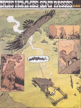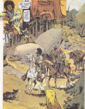 remarques: | naissance de Jeremie mais l'histoire de l'album commence 7 ans après Buddy est obligé de tuer une louve et Jeremie veut absolument adopter le louveteau à qui on donne comme nom "petit loup" rencontre avec les chercheurs d'or: Curly, Dallas et Thomas devenu adulte, petit-loup rejoint les siens au grand chagrin de Jeremie visite à la tribu des sioux, parents de Chinook où Buddy participe à une grande chasse aux buffalos >> p. 27 la grande chasse aux buffalos >> p. 30 la réception à la cabane au retour de Buddy mais à leur retour, les chercheurs d'or se sont installés dans leur cabane, Buddy est obligé à travailler pour eux tandis que Chinook doit faire la cuisine, toutefois la discorde commence à se manifester entre les 3 bandits alors que Buddy fait tout pour activer leur discorde, finalement Dallas tue Thomas et s'enfuit en prenant Jeremie comme otage, lancé à sa poursuite, Buddy sera aidé par la meute de loups dirigée par petit-loup, Dallas sera tué et Buddy permettra à Curly de partir avec son or maudit >> un bon album avec toutefois un scénario un peu moins recherché et un graphisme aux couleurs moins prononcées que les deux albums précédents n.b. Curly ressemble beaucoup à Cosey, ami de Derib et c'est le plus sentimental des bandits |