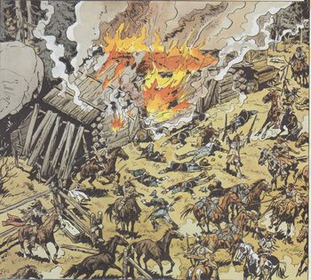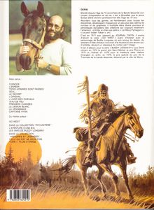 remarques: | >> p. 3/4 le graphisme de la perspective, genre dessin animé sur le chemin du retour, Buddy et Michael rencontrent une patrouille de soldats dirigée par Ryan qui a été nommé capitaine, les paroles haineuses du capitaine envers Buddy déclanchent une rixe, fuite de Buddy et rencontre avec César qui l'informe que Chinook et Kathleen ont été chassées du fort et sont parties rejoindre les sioux Oglala >> p. 20 le nouveau colt Walker qui tire six coups de suite sans être rechargé remis par César à Buddy la cabane de Buddy est maintenant occupée par des pionniers, l'attaque des Crows, la cabane de Buddy est détruite par le feu, seuls survivants le jeune Jimmy et son chien ainsi que le sergent Garit qui est sauvé par Buddy >> p. 28 l'attaque des Crows sur les tuniques bleues près de la cabane de Buddy Buddy chez le chef Black Feet "cheval qui bouge" reçoit des nouvelles de Chinook et Kathleen, mais le camp des Black Feet est attaqué par Ryan pour représailles, Buddy tue Ryan, le sergent Garit toutefois innocente Buddy en déclarant que Ryan est tombé au combat contre les indiens dans cet album commence la quête de Buddy pour Chinook et Kathleen, quête qui durera durant les 5 prochains albums >> un bon album tout à fait intéressant et qui commence le cycle de la quête de Buddy |