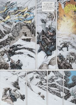 remarques: | 10ème volet: 1926, Arabie Séoudite, Sibérie thèmes principaux: - la conquête de l'Arabie Séoudite (Médine, La Mecque, Djedda) par l'émir Ibn Seoud et son histoire - la chute du météorite à Toungonska en Sibérie = 1000x la bombe d'Hiroshima 1926, port de Djedda en Arabie occupé par les mercenaires turcs et allemands de Hussein, chérif de la Mecque, dernier des Hachémites, descendant de Mahomet, qui est pris d'assaut par les fidèles Ikhwans d'Ibn Seoud, l'imam des Wanhabites, secte de l'islam sunnite, ceux-ci puissamment soutenus par Philby et ses ivoires à Djedda, Lawrence d'Arabie et Curtis à nouveau brièvement réunis, inspectent les évènements pour le compte d'Erlin >> p. 7 l'histoire d'Ibn Seoud protégé par l'ivoire noire de Philby, c'est ce qu'on appelle la "baraka" >> p. 10 la charge sur Djedda par les cavaliers de Ibn Seoud au nom de "Allah ou Akbar", l'armée moderne avec artillerie et aviation de Hussein étant détruite par les pouvoirs de Philby >> p. 17 la légende de la pierre noire de la Kaaba à La Mecque = le saint des saints de l'Islam en remerciement, Ibn Seoud ordonne à Philby de remettre l'ivoire noire à Dyo qui a soutenu Ibn Seoud 1926, Ukraine, Itzak travaille pour Aker alors que le baron Sebottendorf recherche Itzak pour le compte de Guillaume et que Dyo contrôle les bolchéviks >> p. 29 revolvériser = tuer avec un revolver Itzak a trouvé refuge chez les Soyotes qui vénèrent Obo, l'esprit de la montagne, Sebottendorf est sur le point de s'emparer d'Itzak mais grâce à l'Obo, les troupes de Sebottendorf sont mises en déroute et Itzak appelé maintenant l'ange de la mort se retrouve avec la légion tchèque dans le transsibérien en Mandchourie où il sera interviewé par Jack London, lui aussi en Mandchourie à cette époque >> p. 41 l'autel des croix gammés >> p. 47 le sanctuaire de Toungouska détruit par un grand éclair lorsque les moines rouges ont voulu violer le sanctuaire >> un scénario toujours bien compliqué, mais bien raconté avec un graphisme tout à fait respectable |