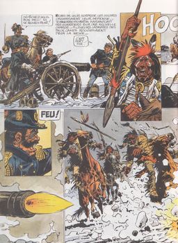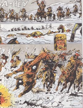 remarques: | Buddy arrive dans les territoires des sioux, rencontre avec Petit Loup qui semble l'avertir d'un danger imminent >> p. 7 Petit Loup est devenu un vieux loup l'attaque des sioux rebelles, Buddy est capturé par Tonnerre-du-matin et blessé, il est soigné par le sergent Hoffman également prisonnier des sioux >> p. 15 discussions sur la mort, la peur de mourir et cela fait maintenant déjà 20 ans que Buddy a épousé Chinook, tous deux sont mis au poteau de torture, mort d'Hoffman en brave soldat, mais Buddy est sauvé par l'apparition de Petit Loup, "l'ami d'un loup ne peut mentir" dixit Tonnerre-du-matin, chef des sioux rebelles et Buddy est libéré rencontre avec Nuage Gris, puis Buddy est capturé cette fois par un détachement de cavalerie mené par le colonel Carrington, un officier peu commode qui veut faire parler Buddy, mais celui-ci est délivré peu après par Nuage Gris combat entre les tuniques bleus et les sioux rebelles de Tonnerre-du-matin >> p. 40/41 la charge des sioux "hooka-hey" brisée par le canon Buddy réussit à neutraliser le canon, mais le combat reste féroce et de nombreux combattants restent sur le terrain, puis Nuage Gris informe Buddy du lieu exact où se trouve Chinook >> p. 46 les hommes plus cruels que les loups et dans les yeux du loup, toute la tristesse du monde >> un album bien meilleur que le précédent, un peu genre Blueberry dans l'album "tête jaune" |