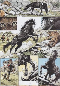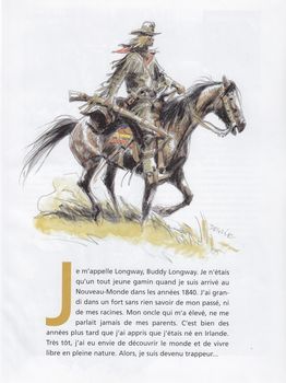 remarques: | la suite des aventures de Buddy et Chinook cinq ans après le dernier album prologue les débuts de Buddy Longway en 1840 avec le résumé des 16 premiers albums (mais pas toujours conforme aux récits originaux >> à comparer avec l'album no 14 la robe noire) réunis avec Kathleen, Buddy et Chinook veulent maintenant retrouver Jeremie, mais auparavant Buddy doit encore accompagner les sioux dans leur nouvelle réserve où on retrouve aussi Gregor et Mariska établis comme administrateurs de la réserve, Buddy part avec deux soldats pour capturer des chevaux sauvages destinés à l'armée, mais les deux soldats ont l'intention d'éliminer Buddy >> p. 20 Buddy trouve un troupeau de chevaux sauvages, mais il est agressé par le cheval "danseur" qui est contrôlé par le vieil indien "regarde-au-dessus-des-nuages" l'histoire de regarde-au-dessus-des-nuages qui vit avec les chevaux sauvages et qui informe Buddy que pour capturer ces chevaux, il faut savoir aussi les respecter >> p. 23 la vallée des chevaux sauvages finalement Buddy réussit à capturer un bon nombre de mustangs, mais sur le chemin du retour, les deux soldats provoquent un incendie de prairie pour éliminer Buddy et ses chevaux, toutefois l'incendie se retourne sur les deux soldats dont l'un est Lindsay fille du capitaine Ryan déguisée en soldat qui veut venger la mort de son père, celle-ci est gravement brûlée par l'incendie et avoue ses intentions à Buddy avant de mourir, mais l'autre soldat Lewis, fiançé à Lindsay réussit à s'enfuir et Buddy, Chinook, Kathleen accompagnés par Nuage Gris continuent leur route avec le troupeau >> un album souvenir dédié surtout aux chevaux, le graphisme est toujours bon mais a sensiblement changé (devenu un peu plus grossier) et le texte n'est plus aussi recherché, un album produit pour continuer la série, mais on a l'impression que le coeur n'y ait plus pour l'auteur, début de série finale n.b. les pages de garde changent à nouveau ainsi que la couverture et le 4ème plat |