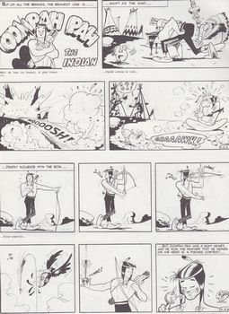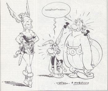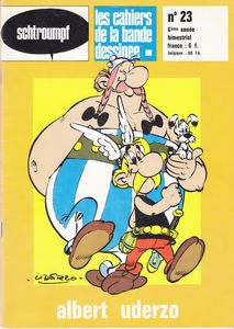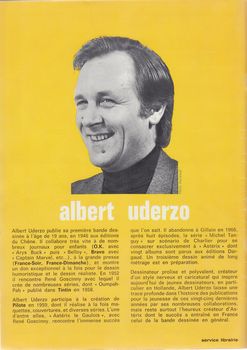 remarques: | Albert Uderzo né en 1927, mort en 2020, dessinateur célèbre français d'origine italienne 1) entretiens avec Uderzo by Numa Sadoul voulait faire carrière dans l'aviation mais débutera en BD dans les éditions du Chêne en 1945 avec un personnage du nom de Clopinard, continue dans le journal OK avec Arys Buck et Belloy, rencontre par la suite avec Charlier et Goscinny, curieusement Uderzo et Goscinny (du moins Uderzo) ne seront jamais acceptés par le journal de Spirou (Dupuis) création en 1959 de Pilote et d'Astérix avec Goscinny ainsi que Tanguy et Laverdure avec Charlier (Uderzo critique un peu Charlier mais loue Goscinny qui est resté son meilleur ami), Uderzo est un dessinateur solitaire qui a surtout été influençé par Walt Disney, Calvo et Pat Sullivan (Felix the cat) 2) les personnages d'Astérix by Numa Sadoul univers autarcique, non conventionnel, dans un petit village sans nom quelque part en Armorique - Astérix nom tiré d'une étoile - Obélix peut'être le véritable héros, adulte avec des réactions enfantines, tailleur de menhirs - Idéfix petit chien qui apparait dans l'album "tour de Gaule" et qui deviendra le plus fidèle compagnon d'Obélix et ami des arbres - Panoramix le druide, personnalité la plus importante du fait de la potion magique autres personnages: - Abraracourcix, chef du village - Assurancetourix, barde incompris - Cétautomatix, forgeron du village qui ne peut souffrir Assurancetourix - Ordralfabétix, poissonnnier du village et où ses poissons jouent un rôle important dans la vie du village - Agecanonix, le doyen du village avec sa très jeune épouse les méchants: - Jules César mais ses ennemis sont souvent les ennemis des gaulois - les romains - les pirates (parodie de Barbe Rouge) 3) Tanguy et Laverdure by Jean-Louis Picco paraît pour la première fois dans le no 1 de Pilote, thème de l'aviation militaire similitude de Tanguy avec Buck Danny et de Laverdure c'est aussi un reportage d'actualités avec de nombreux détails techniques 4) documentaire sur Oumpah-Pah le peau-rouge by François Rivière avec 6 planches inédites publiées en 1955 pour le public américain, récit dynamique, anecdotique avec description présumée des moeurs des peaux-rouges et avec Hubert de la Pâte Feuilletée, c'est un précieux chez les hurons 5) le gag visuel secondaire chez Uderzo by Eric Baccard réflexion sur Idéfix et son rôle de vedette dans l'album "Astérix et Cléopâtre", omni-présence aussi de la poule (similitude avec Gotlib) 6) la polyvalence graphique by Gianni Brunoro le style Uderzo: mélange de réaliste et de caricature, différence entre Astérix (jeux de mots) et Tanguy+Laverdure (caricatures) précision documentaire et littéraire tel l'orgie romaine dans "Astérix chez les Helvètes" = allusion au film "satyricon" et le graphisme d'Uderzo ne cède en rien au scénario de Goscinny, les deux se complétant parfaitement 7) bibliographie d'Uderzo - dans OK 1946-1948 Arys Buck et Belloy - dans Kid Magazine 1948 le trésor de l'île fantôme - dans Bravo 1950 captain Marvel Junior - dans Junior 1957 Luc Junior (avec Goscinny) - dans Pistolin 1955-1958 Belloy (avec Charlier) - dans Tintin 1958-1962 Oumpah-Pah et la famille Moutonet (avec Goscinny) >> voir photos ci-dessous - dans Pilote 1959-1973 Jehan Soupolet et Belloy + Tanguy et Laverdure (avec Charlier) ainsi qu'Astérix (avec Goscinny) >> un bon fascicule d'étude sur Uderzo, peut'être un peu trop complexe dans les derniers chapitres annexes - couverture du CBD avec caricature - 4ème plat avec Uderzo - une des premires planches de Oumpah-Pah en anglais - deux planches extraits du journal de Tintin |