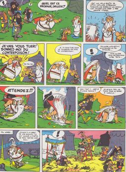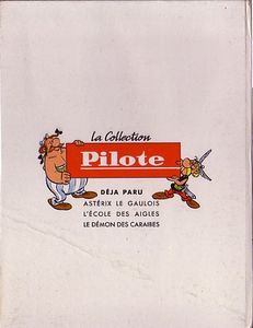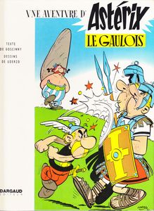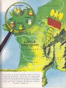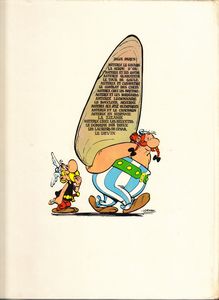 remarques: | dernier titre au dos: le devin, album de 48 pages le grand début de la série Astérix où l'on peut constater l'influence de la série Oumpah-Pah (le village et ses représentants) dont le graphisme est d'ailleurs meilleur que dans ce premier album d'Astérix et selon Uderzo la page 35 aurait été dessinée par Marcel, frère d'Albert (mais pratiquement pas de différence) le petit village gaulois en Armorique cerné par les 4 camps romains de Petitbonum, Aquarium, Laudanum et Babaorum (n.b. on ne connaîtra jamais le nom du petit village gaulois), un espion romain déguisé en gaulois réussit à se glisser dans le village gaulois et découvre la potion magique fabriquée par le druide Panoramix, Caius Bonus, chef de Petitbonum, décide alors d'enlever Panoramix pour s'approprier la potion magique et confie la mission à Marcus Sacapus, son aide de camp >> p. 9 le jeu de la chaise musicale chez les romains alerté, Astérix se rend au camp de Petitbonum pour délivrer Panoramix et les deux compères joueront un bon tour aux romains en leur faisant goûter une lotion capillaire au lieu de la potion magique >> p. 33 des fraises comme ingrédients pour la potion magique >> p. 39 des romains bien barbus, semblables aux Dupondt dans on a marché sur la lune les deux amis retournent à leur village après avoir indirectement révélé à César, arrivé impromptument, le complot de Caius Bonus, première rencontre avec César >> ce n'est pas encore le scénario recherché de Goscinny ni le graphisme étudié d'Uderzo mais c'est un bon début, apparition d'Obélix qui ne joue toutefois pas encore un grand rôle et à la fin du récit Assurancetourix participe encore au banquet final (pour la première et dernière fois) n.b. ce premier album fait partie de la collection Pilote qui comprend les 6 premiers albums et qui sera remplacé dès le tome 7 par la collection dite au menhir (voir photos) n.b. à noter aussi la carte des gaules en page de garde avec le petit village gaulois sous la loupe où l'on distingue à gauche du village les 3 pierres qui selon certains chercheurs auraient pu identifier la situation du village gaulois en Bretagne, en tout cas c'était à proximité de Condates (Rennes) - à noter les premières pages avec souvent un ciel rouge ou orange, ceci dû à la daltonie de Uderzo - c'est l'histoire que reprendra le premier film sur Astérix annexes - couverture de l'album - page de garde - 4ème plat édition originale - 4ème plat au menhir - page extraite de l'album Information - Astérix, anciennement Astérix le Gaulois, est une série de bande dessinée française créée le 29 octobre 1959 par le scénariste René Goscinny et le dessinateur Albert Uderzo dans le no 1 du journal français Pilote, après la mort de René Goscinny en 1977, Albert Uderzo poursuit seul la série, puis passe la main en 2013 à Jean-Yves Ferri et Didier Conrad - la série met en scène en 50 av. J.-C. (peu après la conquête romaine) un petit village gaulois d'Armorique qui poursuit seul la lutte contre l'envahisseur grâce à une potion magique préparée par le druide Panoramix, cette boisson donnant une force surhumaine à quiconque en boit, les personnages principaux sont le guerrier Astérix et le livreur de menhirs Obélix, chargés par le village de déjouer les plans des Romains ou de soutenir quiconque sollicite de l'aide contre la république romaine - publiée dans Pilote de 1959 à 1973, la série est éditée parallèlement en album cartonné, pour les vingt-quatre premiers albums, d'abord aux éditions Dargaud, puis à partir de 1998 aux éditions Hachette et enfin aux éditions Albert René pour les dix albums suivants, les ventes cumulées des albums, traduits dans cent onze langues, représentent 380 millions d'exemplaires, ce qui en fait la bande dessinée européenne la plus vendue dans le monde - la série est avant tout humoristique et parodie principalement la société française contemporaine à travers ses stéréotypes et ses régionalismes, ainsi que des traditions et coutumes emblématiques de pays étrangers, le comique de répétition est très présent avec notamment le naufrage des pirates, le dessin est lui semi-réaliste, fortement inspiré de l'école de Marcinelle (envers celle de Bruxelles) - en règle générale, il convient de rappeler qu'en dépit des efforts de documentation, l'univers d'Astérix est très loin de la réalité historique puisque souvent, il consiste à appliquer "l'esprit" moderne plus ou moins caricatural d'un pays, à sa forme antique, il ne s'agit pas alors d'approximation involontaire mais bien d'un esprit de décalage explicite, par exemple, dans la Lutèce astérixienne (qui tient pour cette Gaule fictive le rôle d'avant-garde de l'art, de la fête et de la mode que tiendra ensuite le Paris contemporain pour la "province", ce qui en soi, est déjà éloigné de la réalité historique de la position de Lutèce en Gaule romaine) - un pigeonnier géant singe trait pour trait la Tour Eiffel, tandis que la ville accueille une délégation du comité olympique grec, afin qu'il lui permette d'accueillir l'organisation des jeux, assimiler le fonctionnement des jeux modernes, se passant dans des lieux à chaque fois différents, à celui des jeux antiques originaux est bien entendu absurde sur le plan historique, mais l'esprit d'Astérix n'est justement pas dans la retranscription fidèle de l'Histoire, autre exemple: dans la bande dessinée, la Germanie contemporaine de Jules César (assimilée dans l'album aux seuls Goths, Wisigoths, Ostrogoths) est en partie un amalgame de références au militarisme prussien, au Reich hitlérien et au célèbre morcellement politique interne du Saint-Empire romain germanique, dans les îles Britanniques, les Bretons jouent au rugby dans des stades, on y croise des roulottes à deux étages rappellant les célèbres bus à impériale londoniens, on montre 4 bardes célèbres qui sont