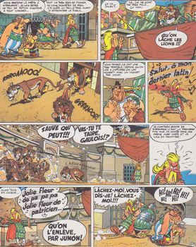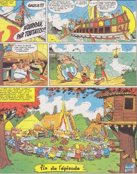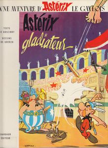 remarques: | dernier titre: les lauriers de César le préfet Alavacomgetepus (parodie de Goscinny) arrive à Petitbonum, il veut faire cadeau à César d'un gaulois irréductible, le sort tombe sur Assurancetourix qui est enlevé par les romains alertés, les gaulois envahissent le camp de Petitbonum mais Assurancetourix est déjà en route pour Rome, Astérix et Obélix décident donc de se rendre à Rome en embarquant sur la galère d'Epidemaïs, le phénicien >> p. 10 le sens de manoeuvre de l'armée romaine >> p. 13 sanglier en latin = singularis porcus >> p. 16 l'abordage du navire pirate d'Eric le Rouge (parodie de Barbe Rouge et épisode qui réapparaîtra inlassablement au gré des aventures d'Astérix et Obélix) s'en suit des aventures romaines pour Astérix et Obélix >> p. 18 scènes de vie romaine >> p. 21 première exclamation d'Obélix "ils sont fous, ces romains" >> p. 20/21 les bains romains >> p. 28 les thermes >> p. 22 les HLM romains (habitations latines mélangées) César décide de jeter Assurancetourix aux lions de l'arène, Astérix et Obélix, pour le sauver, veulent devenir gladiateurs, ils sont engagés par Caius Obtus et son assistant Briseradius, mais les deux gaulois sèment la panique dans les jeux du cirque en organisant des jeux enfantins avec les gladiateurs (répondre par oui ou par non), César est furieux mais comme le peuple applaudit, il veut bien pardonner aux gaulois et la générosité de César accorde aux gaulois la grâce de retourner dans leur pays en détruisant sur le chemin du retour à nouveau la nouvelle galère de Eric le Rouge >> p. 30 la confiture d'épluchures de saucissons >> p. 38 belle planche avec César et son fils Brutus (quoque fili!) >> p. 48 le festin des gaulois, mais sans le barde et les femmes gauloises >> premier album classique de la série qui inaugure ce qu'on pourrait appeler l'âge d'or d'Astérix, texte et graphisme s'affinent, maîtrise du style antique (les décors romains, restaurants, thermes, etc), un superbe coloriage et une technique d'imprimerie (offset?) qui ne pourra plus être égalée dans les années 80 lors des rééditions les personnages secondaires Assurancetourix (qui est le héros de cette histoire) ainsi que César sont bien approfondis |