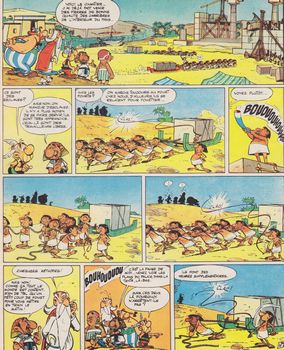 remarques: | dernier titre: Astérix et Cléopâtre, édition originale (couverture d'album avec traces de scotch mais intérieur en TBE, côté au BDM Euros 300.-) César à Alexandrie où Cléopâtre lui promet de lui faire construire un temple afin de démontrer que son peuple a gardé tout son génie, l'architecte Numérobis est chargé de sa construction mais celui-ci n'en est pas capable et part chercher en Gaule l'assistance de son vieil ami Panoramix. >> p. 5 le célèbre nez de Cléopâtre >> p. 7 Numérobis est un alexandrin et son bateau s'appelle le Napadelis Panoramix accepte d'aider Numérobis et part pour l'Egypte avec Astérix et Obélix qui veut maintenant absolument amener avec lui le petit chien >> p. 8 le petit chien blanc est officiellement baptisé Idéfix >> p. 9 durant le voyage, nouvelle rencontre malheureuse pour E'ic le 'ouge (dixit le marin noir) >> p. 11 la collation préférée de Cléopâtre: des perles dissoutes dans du vinaigre (voir information) arrivée à Alexandrie, rencontre avec Amonbofis, architecte concurrent de Numérobis qui va s'efforcer d'entraver les travaux de Numérobis >> p. 12 la maison de Numérobis >> p. 14/15 les conditions de travail sur le chantier égyptien >> p. 19 Obélix qui parle égyptien >> p. 21 le sphinx et l'origine de son nez cassé Tournevis, l'assistant de Amonbofix réussira à égarer le trio gaulois lors d'une visite de la grande pyramide et ceux-ci ne seront sauvés que grâce à l'intervention de Idéfix et de son flair perspicace qui trouvera la sortie, puis les médisances d'Amonbofix conduiront Cléopâtre à faire arrêter le trio, mais Astérix réussira à prouver leur innocence enfin les efforts sans succès de Amonbofis conduiront César à empêcher la construction du temple mais la colère de Cléopâtre (qui, si elle a un beau nez a aussi un fichu caractère) remettra César à l'ordre et finalement le temple sera inauguré en grande pompe >> p. 26 un obélisque pour Obélix >> p. 39 la tactique romaine de la tortue et celle du lièvre >> p. 47 allusion à Ferdinand de Lesseps et du canal de Suez >> l'album-phare qui consacra le succès du phénomène Astérix, un scénario bien exécuté et un graphisme superbe avec déjà des calembours bien astériens dans cet album, les principaux personnages seront Idéfix et Numérobis tandis qu'Obélix inaugurera à son retour une nouvelle fabrication de menhir en forme d'obélisque n.b. dans cet album, Goscinny caricature le film le plus cher de tous les temps "César et Cléopâtre" (1963) et il suffit de regarder la couverture (originale) éloquente de l'album pour comprendre l'état d'esprit taquin des deux auteurs, peut'être l'album le plus célèbre de la série, un incontournable de la BD française, décors somptueux et très cinématographiques, mais peut'être pas non plus le meilleur album de la série annexes - couverture de l'album original et du 4ème plat - 4ème plat de la collection Pilote (dernier album au 4ème plat collection Pilote) - 2 planches extraites de l'album n.b. à comparer le graphisme de l'édition originale avec une réédition de 1981, différence dans le coloriage, plus foncé dans l'édition 1965 Information - le Banquet de Cléopâtre est un tableau de Jacob Jordaens (1593-1678) conservé au musée de l'Ermitage de Saint-Pétersbourg, composé en 1653, il représente Cléopâtre qui a invité à bord de son navire Marc-Antoine - pour flatter le goût du faste de Marc-Antoine, elle l'invite au son des luths et des cithares à un banquet en son honneur à son bord - Cléopâtre arbore une somptueuse parure de perles, pour impressionner Marc-Antoine par le luxe de ses repas, Cléopâtre se joue de lui en faisant dissoudre une énorme perle dans du vinaigre avant de le boire, ceci pour lui signifier que la somme d'argent dont Marc-Antoine a besoin pour faire sa guerre contre les Parthes, est modifiée et qu'en faisant fondre la perle dans du vinaigre, celui-ci devient un breuvage inestimable |