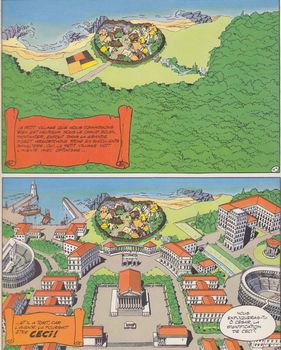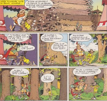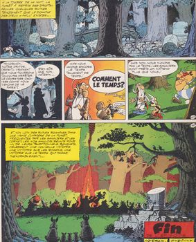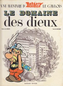 remarques: | dernier titre: le domaine des dieux à noter l'impression est faite par une maison allemande, la qualité graphique s'en ressent et curieusement l'album ne comporte que 47 pages projet immobilier autour du village gaulois, dont César veut ainsi créer une amphoreville (genre de bidonville) en construisant une cité moderne afin que les gaulois soient obligés de quitter leur village en s'installant dans les immeubles romains plus confortables et et s'adapter ainsi aux coutumes romaines l'architecte Anglaigus est chargé de la réalisation du projet qui s'appellera le domaine des dieux >> p. 6 le terme de thermerie, expression typiquement astérixien, rapport à des salons de beauté mais la forêt autour du village donne du mal aux constructeurs, car les arbres abattus de nuit (pour éviter les gaulois) repoussent durant la journée grâce aux graines magiques inventées par Panoramix, puis Astérix fournit de la potion magique aux esclaves chargés des travaux d'abattage afin que ceux-ci puissent se soulever contre leurs maîtres (difficile à admettre, maître, etc) mais les esclaves négocient des accords sociaux avec leurs maîtres et continuent leur travail, toutefois Panoramix ne veut pas utiliser la violence contre les esclaves >> p. 7 et 12 Idéfix n'aime vraiment pas que l'on abîme ses arbres >> p. 9 et avant de déboiser, il faudra dégauloiser >> p. 18 chez Anglaigus, les troncs s'amoncellent, mais la forêt renaît toujours >> p. 22 l'accord social entre Duplicatha, chef des esclaves numides et leur maître Anglaigus finalement le domaine des dieux est en voie de finition et les premiers romains s'y installent après une campagne de promotion >> p. 28/29 la campagne de promotion >> p. 30 l'ordonnateur des jeux Guilus les résidents romains commencent à perturber la vie autarcique des gaulois en faisant monter les prix, ce qui dérange la vie paisible des villageois, Astérix fait alors intervenir Assurancetourix à qui il fait louer un appartement dans le domaine des dieux et sa musique a tôt fait de faire fuir les romains ainsi que les légionnaires venus à la rescousse le village est sauvé, ce n'est toutefois qu'une victoire momentanée sur le temps et le banquet final se déroulera dans la forêt armorique avec le sauveur: Assurancetourix et avec les sangliers qui sont de retour dans la forêt >> un bon album avec un scénario plutôt original et surtout à nouveau de bons jeux de mots tel que en parlant des esclaves numides (p. 20) "il ne faut jamais parler sèchement à un numide", le graphisme est toujours bon tout comme le coloriage |