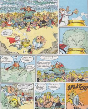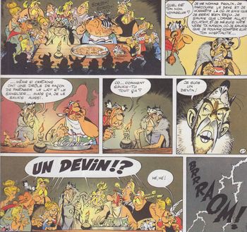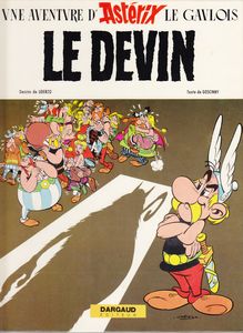 remarques: | dernier titre: le devin le ciel tombe sur la tête des gaulois sous la forme d'un orage effroyable, c'est alors qu'apparait le devin Prolix >> p. 7 l'apparition démoniaque du devin Prolix >> p. 9 intermède explicatif sur les devins, haruspices, prophètes, oracles et autres augures les gaulois sont impressionnés par le devin (sauf Astérix), Bonemine va même à rechercher les services du devin et à le protéger d'Astérix en le flattant et en cajolant son mari, l'appelant "cochonnet" au grand dame d'Astérix et d'Obélix en l'absence de Panoramix, le village tombe sous l'influence du devin et Astérix n'est plus écouté, Prolix, en combine avec le centurion Faipalgugus de Petitbonum, conseillera même aux gaulois de quitter leur village sous peine que le ciel leur tombe sur la tête, les gaulois se réfugient alors sur une île voisine et les romains occupent le village, mais au retour de Panoramix, celui-ci reprend les choses en main et veut se débarrasser des romains en fabricant une potion nauséabonde qui chasse les romains du village, puis Panoramix confond le faux devin lors d'une nouvelle bagarre mémorable avec les romains et le banquet final pourra avoir lieu au village après qu'un orage ait balayé la pollution causée par Panoramix >> l'action est plutôt moyenne pour cet album où les gags n'abondent pas trop et où le scénario n'a rien de très original, le graphisme (Astérix est dessiné plus grand que d'habitude) est toutefois respectable, mais la qualité graphique est moins bonne (impression par imprimerie Molière à Lyon au lieu de DMC, Mulhouse) n.b. à noter une petite information sur les dieux gaulois lors de l'orage du début: - Toutatis, dieu de la tribu - Sucellus, dieu des morts - Taranis, dieu du tonnerre - Belenos, dieu guérisseur - Esus, dieu de la vie - Epona, déesse de la guerre - Borvo, dieu des sources - Cernunnos, dieu de la nature - Rosmerta, déesse de la Providence - Sequana, déesse de la Seine avec le no 75 - Amora, déesse de la moutarde |