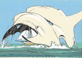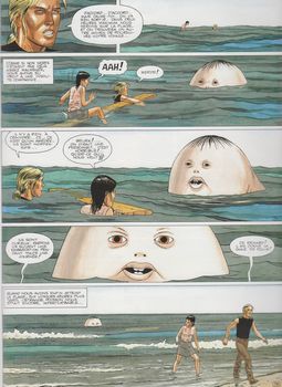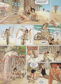 remarques: | réédition, album couleur 48 pages l'aventure se poursuit avec le duo Kim/Marc en route pour Anatolie sur le navire "Amaris" mais suite à une querelle avec le capitaine, nos deux amis se retrouvent naufragés et s'échouent sur une plage, ils continuent leur voyage à pied >> p. 9 le monstre marin au visage humain >> p. 12 vomissements et p. 13 saignements (les règles de Kim) >> p. 14 le phare du bout du monde >> p. 16 la poulpe des sables qui prend la forme de ses proies rencontre avec le musicien Cabral qui est devenu un fugitif car la musique moderne est interdite par le gouvernement, cette musique détournant les gens du travail!! entretemps Driss le biologiste patrouille l'océan avec son avion retro en bois et découvre peut'être la mantrisse, un être mutant qui peut prendre plusieurs formes, cette fois avec des structures symétriques Marc et Kim arrivent à Jandira Cross, relais de dirigeables alimentés à l'hélium par des caravelles apprivoisées (= dinosaures volants) ils assistent à l'arrestation par la police de la jolie blonde, partenaire de Driss >> p. 25 les caravelles apprivoisées Marc par hasard réussit à libérer la belle blonde et à prendre la fuite avec elle sur une caravelle mais la blonde est gravement blessée par un tir de la police, elle se remet toutefois étonnemment vite et bien de ses blessures dont l'amputation de la main gauche >> p. 32 l'amputation de la main effectuée par Marc avec ses dents!! l'histoire d'Alexa Komaroya qui fait partie d'un groupe de huit scientifistes qui ont fait une découverte étonnante qu'ils ne veulent pas révéler au gouvernement >> p. 39 parmi les colons d'Aldébaran, il y a aussi une colonie de noirs >> p. 41 le temps de faire un petit besoin >> p. 43 la main d'Alexa qui commençe déjà à repousser mais en s'éloignant quelque peu d'Alexa, Marc est fait prisonnier par un dirigeable de la police et retrouve Kim, qui a aussi été capturée, dans les prisons d'Anatolie >> la saga continue en s'améliorant quelque peu mais le texte comporte toujours encore quelques scènes mièvres, néanmoins toujours agréables à la lecture et Marc aurait pu chanter: "auprès de ma blonde, qu'il fait bon, fait bon, fait bon" |