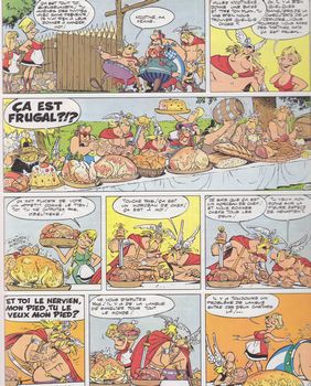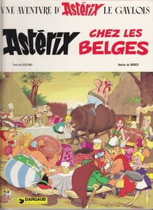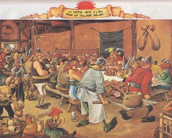 remarques: | dernier titre: Astérix chez les Belges dernier album avec la participation de Goscinny de nouvelles romaines troupes arrivent à Laudanum pour se reposer dont le légionnaire Pierre Tchernia (il paraîtra au moins 4x dans les aventures d'Astérix) qui part en patrouille et rencontre Astérix et Obélix à qui il explique que lui et ses camarades ont été mis au repos à Laudanum après avoir bagarré contre les belges qui sont les guerriers les plus braves de Gaule, César dixit >> p.6 des romains bien joyeux Abraracourcix part avec Astérix et Obélix chez les Belges pour démontrer le contraire et ce sera Jules César comme arbitre qui doit juger leur combativité >> p. 10 le conseil de guerre par Abraracourcix qui traite de comiques Astérix et Obélix >> p. 14 rencontre avec les guerriers belges et leur chef Gueuselambix qui traite les gaulois de celtillons, tout cela dans un accent à faire trancher la crème >> p. 20 le plat pays qui est le leur >> p. 21 Annie Cordy sous les traits de Nicotine et Obélixeke charmé par une belle belge appelle Astérixeke qui traite Obélix d'Imbécileke >> p. 31 apparition des Dupont-Dupond qui annoncent l'arrivée de César (n.b. Uderzo rend la pareille à Hergé qui avait fait un clin d'oeil à Astérix dans "Tintin et les Picaros", peut'être deux auteurs en mal d'imagination qui ne savent plus très bien quoi inventer pour remplir leurs pages) >> p. 39 le messager rapide = Eddy Merckx et bien sûr >> p. 34 le Manneken piss la suite se résume en d'innombrables bagarres contre les romains et même entre belges et gaulois pour savoir qui sont les plus braves et finalement c'est César qui aura le mot de la fin en considérant les uns aussi fous que les autres, ce qui induira belges et gaulois à se retrouver tous deux à même égalité et de retour ce sera le banquet final avec un petit lapin tout triste suite à la mort de Goscinny durant la création de la planche 37 où Uderzo apprend la mort de Goscinny >> p. 37 discussion avec César pour le concours afin de départager les braves belges des braves gaulois >> un scénario à la belge pas trop recherché malgré les histoires belges, l'accent belge, la table belge avec cervoise, les petits choux (brassica) et l'invention des pommes frites avec des moules, les citations de Victor Hugo sur la morne plaine de la bataille de Waterloo (où belges et gaulois se battent) et pour finir le banquet final sans surprise avec en plus du banquet peint sur le modèle du tableau de Breughel, mais malgré tous ces gadgets, ça est pas le meilleur album une fois, mais ça n'est pas non plus le pire, le graphisme restant acceptable avec un coloriage qui reste lui toujours fade, imprimé par arti grafiche à Bergamo et dernier album avec les pages de garde de couleur brune annexes - couvertures 1er et 4ème plat - le banquet frugal avec les belges - le banquet de Breughel - les terribles guerriers belges façe aux terribles guerriers gaulois |