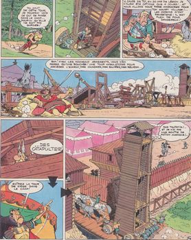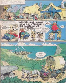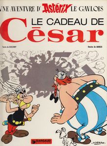 remarques: | dernier titre: le cadeau de César fin de service pour les légionnaires vétérans de César et le cadeau de César au légionnaire ivrogne Roméomontaigus qui s'est moqué de lui: une plaque de César lui donnant la propriété sur un petit village gaulois d'irréductibles, mais le nom du petit village n'est toujours pas mentionné sur la plaque malgré qu'il est dans ce récit une grande vedette de l'album >> p. 5 une auberge à Rome la nuit Romeomontaigus vend son droit de propriété à l'aubergiste Orthopédix qui veut en faire un grand domaine >> p. 10 l'arrivée d'Orthopédix, sa femme Angine et leur fille Coriza au village gaulois les gaulois se moquent d'Orthopédix, mais Abraracourcix qui décèle en Orthopédix des liens familiaux similaires à Abraracourcix (les frères des épouses respectives) lui accorde le droit d'ouvrir une auberge dans le village, auberge qui est nommée "à la brise vivifiante" toutefois Bonemine et Angine se prennent vite de querelle et Angine veut faire d'Orthopédix le nouveau chef du village, s'en suit und discorde parmi les habitants du village, divisés entre les deux chefs lors de la campagne électorale, même Astérix et Obélix se querellent à ce propos, Obélix s'étant entiché de Coriza qui fait tout pour le charmer et le faire voter en faveur de son père réapparition de Romeomontaigus qui veut reprendre son droit de propriété, il est chassé par Astérix >> p. 27 sous le signe de Zorro mais Romeomontaigus demande alors l'aide de la garnison de Laudanum >> p. 38/39 la nouvelle tactique des romains pour attaquer le village gaulois: les catapultes après avoir toutefois réglé leurs problèmes internes, les gaulois réunis donneront une bonne raclée aux romains et se sera une réconciliation générale lors du banquet final, un banquet final sans grande saveur et il semblerait que Assurancetourix n'est cette fois pas mis à l'écart >> p. 34 à noter: la jolie petite niche d'Idéfix devant la maison d'Obélix >> un bon album avec un sujet original toutefois un texte sans grande finesse, basé sur la politique avec la rivalité des épouses (Angine et Bonnemine) pour la candidature du chef de village, le graphisme est toujours bon mais un peu en baisse et le banquet final manque de saveur, pas de mention de l'imprimerie pour cet album Information les éditions étrangères pour la série Astérix: Afrique du Sud, Amérique hispanophobe, Australie, Autriche, Belgique, Brésil, Canada, Danemark, empire romain (latin), Espagne, Finlande, Hong-Kong, Hollande, Islande, Italie, Japon, Norvège, Nlle-Zélande, Pays arabes, Portugal, République Fédérale allemande RFA (en 1974, il y a encore la République Démocratique RDA), Royaume-Uni, Suède, Suisse, Turquie, Yougoslavie, Pays de Galles |