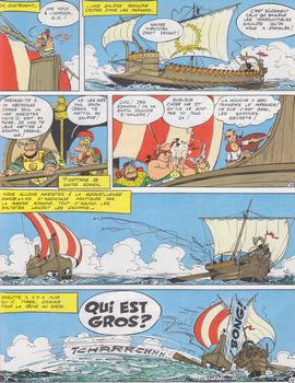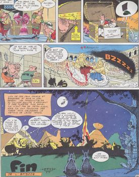remarques: | 2ème album de Uderzo aux éditions Albert René, deux titres au 4ème plat menhir, album imprimé en Italie, pages de garde toujours en bleu foncé en début du récit, les nouvelles ruses des sangliers dans la forêt gauloise pour échapper aux chasseurs Obélix et Astérix, de son côté, César fulmine toujours de ne pas pouvoir soumettre le petit village gaulois et complote avec le chef de sa police secrète, Caius Soutienmordicus, alias Bernard Blier, qui lui propose d'engager un agent secret spécial: le druide-espion Zerozerosix pour s'emparer de la potion magique >> p. 5 petite histoire entre sangliers >> p. 7/8 Zerozerosix, alias bien sûr Sean Connery, avec sa mouche spéciale qui sert de messagère et qui tombe amoureuse de Zerozerosix entretemps, Panoramix a des problèmes d'approvisionnement pour fabriquer la potion magique, il lui manque l'huile de roche = la naphte, il en tombe malade et Zerozerosix qui se dirige vers le village gaulois est mandé à son chevet, il guérira Panoramix grâce à la liqueur de grain calédonienne (le whisky), rétabli, Panoramix demande à Astérix et Obélix de se rendre en Mésopotamie pour ramener la précieuse huile de roche, ils partent accompagnés de Zerozerosix qui veut les en empêcher durant le voyage en route pour la Judée, rencontre avec le voyageur Pazihalé et le guide Saül Péhyé, alias Goscinny chez le marchand Plusdechorus alias Rosenblumenthalovitch >> p. 14 pour les première fois, des romains à cheval >> p. 19 sans potion, les gaulois du petit village sont des invalides dixit Abraracourcix >> p. 35 Ponce Penatès = Jean Gabin >> p. 36/37/38 sumériens, akkadiens, assyriens, égyptiens, mèdes, hittites et compagnies Astérix trouvera l'huile de roche, se débarrassera de Zerozerosix et retournera au village gaulois pour se faire dire par Panoramix que celui-ci n'a plus besoin de l'huile de roche, il l'a remplacé par du jus de betterave fin du récit avec le banquet final comprenant deux sangliers qui regrettent maintenant que leurs vacances soient déjà finies >> un album meilleur que le précédent, mais qui n'a bien sûr pas encore la saveur des scénarios de Goscinny, le graphisme reste bon sans toutefois égaler la finesse des dessin d'antan (voir p. 30 la description de Jérusalem), l'intrusion de Zerozerosix n'est pas vraiment une réussite et les jeux de mots bien qu'améliorés ne sont toujours pas pour la plupart très piquants, seul le voyage en Judée et les petites références à la bible peuvent être de quelque intérêt |