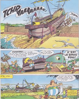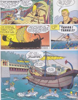remarques: | album dont le titre mentionne pour la deuxième fois Obélix (le premier étant Obélix et Compagnie) sous la direction de Spartakis (Kirk Douglas), des esclaves révoltés se sont emparés de la galère de César (l'Ave César), pour se mettre à l'abri, ils font route vers le village des gaulois irréductibles, entretemps, César veut lancer une nouvelle offensive sur le village gaulois (les insensés) >> p. 10 où l'on se demande ce qui se passerait si Obélix buvait de la potion magique et voilà que Obélix en secret a voulu goûter à la potion magique et il est transformé en statue de granit >> p. 14 le regret d'Astérix "Obélix, espèce de sale bête", Astérix dixit (une expression regrettable d'Uderzo) Panoramix cherche à trouver un contre-poison mais toutes ses tentatives restent vaines, pendant ce temps, l'Ave César arrive au village gaulois, tandis que Obélix reprend vie, mais avec le physique de sa petite enfance >> p. 21 le bébé Obélix au petit cu rond et sans moustache en se promenant dans la forêt, petit Obélix se fait capturer comme otage par une romaine patrouille, il est amené à Rome sur une galère comme monnaie d'échange pour la galère de César, mais Astérix et Panoramix partent à sa poursuite avec l'Ave César >> p. 29/30 même comme bébé, petit Obélix tient à recevoir au menu des sangliers sur la romaine galère, mais ce sera du sanglier bouilli au lieu de sanglier rôti >> p. 33 les pirates à nouveau mentionnés, mais cette fois ils parviennent à un accord avec Astérix Obélix est délivré, la galère de César est cédée aux pirates et la croisière se poursuit en direction de l'Atlantide où Panoramix espère trouver une potion capable de rendre sa forme initiale à Obélix >> p. 37 l'arrivée en Atlantide peuplé de petits enfants uniquement, car les Atlantes ont découvert la potion de la jeunesse éternelle, malheureusement ils n'ont pas la potion pour faire vieillir Obélix, heureusement sur le chemin du retour, une forte émotion fera retrouver à Obélix son physique d'antan >> p. 44 un Obélix pas seulement un peu enveloppé >> p. 48 une remarque peu compréhensive de Cesar: "il est vrai que les lions n'ont jamais eu d'appétit pour le granit, mais par les temps qui courent, quelque chose me dit qu'il se pourrait qu'un jour.." >> un album très moyen, le scénario n'est pas très développé, surtout l'épisode en Atlantide qui est plutôt naïf et superflu, avec quelques anecdotes amusantes mais d'autres très plates, telles celles de l'esclave numide aux répartites de de Michel Leeb (page 8) "présentement et là, dis donc" un album donc de petite qualité malgré l'hommage à Spartacus Douglas et même le titre de l'album ne veut pas dire grand chose, c'est vraiment un peu la galère pour le lecteur n.b. dernier album avec les pages de garde du village gaulois et et la page 49 comporte de la publicité pour les albums de Oumpah-pah, le peau-rouge, imprimé par Brodard Graphique, France |