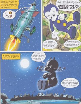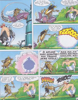 remarques: | autour et dans le village gaulois, la vie s'est figée (sauf pour Astérix, Obélix et Panoramix grâce à la potion magique), c'est alors qu'apparaissent Toune l'ET tadsylvien et ses superclones (genre superman) dans leur affreux vaisseau spatial (>> p. 8-10) >> p. 10 selon Toune, Obélix ressemble à un gros clone après éclaircissement, Toune coupe le champ magnétique anti-collision et tout redevient normal autour et dans le village gaulois Toune explique à Astérix qu'il est venu sur la terre pour confisquer l'arme secrète des gaulois (la potion magique) afin de la protéger des agissements des ET dangereux, les affreux nagmas, qui veulent aussi s'emparer de l'arme secrète >> p. 20 le repas préféré de Toune: le chien-chaud (hot-dog) >> p. 21/22 apparition du nagma qui parle petit nègre et qui fait connaissance avec la force d'Obélix >> p. 22 la série des onomatopées de combat (stupide) >> p. 27 le combat entre les superclones et les goelderas (= guerriers-robots des nagmas) finalement, Panoramix sera d'accord de céder à chaque E.T. une amphore de potion magique, mais celle-ci n'a pas sur eux le même effet que sur les humains, le nagma veut alors enlever Panoramix, mais le tadsylvain l'en empêche et oblige le nagma à quitter la terre définitivement le tout finit par un mémorable combat contre les romains qui s'apprêtaient à envahir le village croyant que le nagma avait anéanti le village avec son vaisseau spatial et Toune se sépare de ses amis terriens en repartant vers sa planète d'origine après avoir fait oublier à ses amis gaulois (et aux romains) cette aventure grotesque (p. 45) >> une catastrophe, cet album est une véritable catastrophe, surtout pour le scénario, mais aussi pour le graphisme et le coloriage (d'ailleurs Uderzo le reconnaît lui-même en page 45: une aventure grotesque) l'idée était pourtant assez bien trouvée: "le ciel qui tombe sur la tête des gaulois" et c'est bien le ciel qui est tombé sur la tête d'Uderzo, mais le récit a été affreusement développé, Goscinny doit se retourner dans sa tombe et certains lecteurs vont même à accuser Uderzo de haute trahison, Uderzo quo vadis? n.b. le 4ème plat de l'album mentionne maintenant tous les albums des aventures d'Astérix, donc Uderzo aurait gagné finalement son procès contre Dargaud, ce qui veut dire que présentemment les aventures d'Astérix ne sont plus qu'une affaire de gros sous à noter que l'album est imprimé en France par la SIRC et porte le numéro 281273 avec en avant-page un hommage d'Albert Uderzo à son frère Bruno qui contribua à faire d'Albert un dessinateur renommé de bande dessinée |