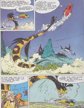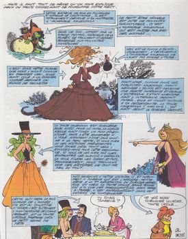 remarques: | scénario: Franquin et Delporte Kalendula et le chuintufle abandonnés dans le jardin des Hespérides ont survécu et Kalendula n'a pas oublié sa vengeance elle parvient à envoûter Hermès grâce au pouvoir du népenthès (un sort fatal) et à l'attirer dans son repaire pour lui faire confectionner l'elixir de beauté qui rendra Kalendula à nouveau jeune et belle >> p. 11 dans son cauchemar-envoûtement, Hermès retrouve ses jambes de satyre >> p. 13 l'once de spermioles pontificaux = un des ingrédients pour la fabrication de l'élixir de beauté Calendula et Isabelle se préparent à sauver Hermès, tout d'abord il leur faut consulter les oracles du delft où elles recoivent aussi la tisane "legen booze droomen" pour sortir Hermès de son envoûtement. >> p. 18-22-23 le pays bleu (avec de jolies couleurs) mais sur le chemin du retour, Calendula et Isabelle sont confrontées aux dangers d'une mer redoutable >> p. 26/27, elle seront sauvées par Alexis, l'inventeur du bathyfoleur et arriveront à temps pour retirer Hermès de l'emprise de Kalendula 2ème petit épisode hors récit: l'averse inverse le poilu-cumulus qui provoque des averses inverses (= pluie provenant d'une étendue d'eau et attirée par un dangereux nuage: le poilu-cumulus), Calendula et Isabelle en viendront à bout en détruisant le nuage avec des vessies explosives >> p. 45 une image érotique de Calendula >> le scénario de cet album est toujours amusant et le graphisme reste charmant et merveilleux |