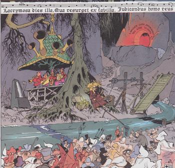 remarques: | scénario: Delporte Isabelle rencontre le jeune orphelin Nico d'origine transylvanienne, Isabelle décide de raccompagner Nico dans son pays en passant par la traboule de Géhenne où justement Hermès vient de découvrir qu'il s'y passe des choses mystérieuses (poltergeist, etc) entretemps, Isabelle et Nico se sont engagés dans la traboule contrôlée par la vieille et laide sorcière Kalendula qui y fait règner le chaos >> p. 18 apparition et description de la Lilith = soi-disant la soeur d'Eve dans le paradis terrestre, soeur qui a mal tourné et qui est devenue la compagne de Satan >> p. 22 Yggdrasil, le frêne géant qui unit le ciel avec la terre (légende scandinave) >> p. 24 et la vieille Kalendula qui perçoit le prix du passage dans la traboule Isabelle et Nico réussissent toutefois à neutraliser Kalendula avec de la colle extra-forte tandis que Lilith veut maintenant créer un enfer sur terre >> p. 34 la coscinomancie = vision en pratiquant la lecture des fonds de tasses de thé Kalendula neutralisée, Lilith et ses démons pourront regagner l'enfer sous terre, Nico rejoindra ses parents et tout rentrera en ordre >> sauf que le scénario est un peu décentré et pas très intéressant tout en restant amusant malgré de nombreuses diableries mais peu d'étincelles, et avec un bon graphisme sans sorcellerie |