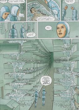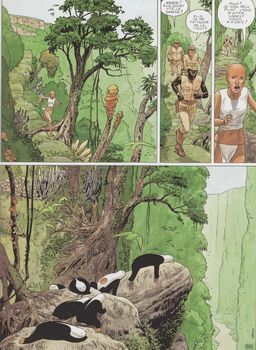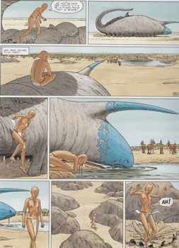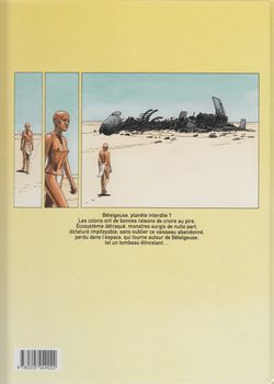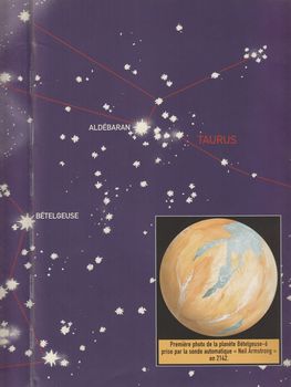 remarques: | IIème cycle après le monde d'Aldebaran sur la planète Bétel-Six du système Bételgeuse, une baleine des sables saccage une colonie établie par un couple dans le désert, une patrouille de police du clan Donovan enlève au couple Maïlan, fille de Bert, âgée de 18 ans, pour l'éduquer selon les règles de la colonie principale >> p. 7 après le désert, la forêt luxuriante durant un évènement causé par une plante-ballon, Maïlan en profite pour s'enfuir pourchassée par les policiers, elle est protégée par ses amis, les iums, curieux aborigènes de la planète, qui la prennent sous leur protection, puis Maïlan se réfugie dans le clan adverse, celui de Leilah, opposé au clan Donovan n.b. Leilah était le commandant en chef du vaisseau spatial "Konstantin Tsiolkowsky" arrivé en orbite autour de Bétel-Six mais dont l'ordinateur est tombé en panne, laissant dans l'espace 3000 colons sans vie après que Leilah et 55 colons aient réussi à rejoindre la planète Bételgeuse dans une navette or, sur le vaisseau, deux humains (Inge et Hector) sortent d'une hibernation de 2585 jours (= 7 ans), ils sont les deux seuls survivants du vaisseau qui transportait 3000 colons sur Bétel-Six, ils cherchent maintenant à trouver une solution à leur condition de naufragés isolés dans l'espace >> p. 30 la salle d'hibernation devenue une salle mortuaire entretemps à Aldebaran, un vaisseau spatial depuis la Terre vient d'arriver avec Kim qui retrouve Alexa, Kim a obtenu sur la Terre un diplôme de biologiste mais elle vit temporairement séparée de Marc et Alexa lui propose de se joindre à une mission qui doit se rendre sur Bétel-Six dont on n'est sans nouvelle des colons qui lui ont été envoyés >> p. 37 sur le vaisseau parti de la Terre pour Aldébaran, il n'y avait pas de douche!! discussions avec Alexa qui est âgée maintenant de 139 ans et qui commençe à devenir dépressive 6 mois plus tard, le vaisseau spatial de Kim avec le commandant Wong et le lieutenant Hudson arrive en vue du vaisseau "Konstantin Tsiolkowsky" qui gravite autour de Bétel-Six, un abordage est prévu et les deux survivants sont sauvés in extremis mais il y a de nouveau un problème d'ordinateur (un virus informatique) et toutes les communications avec la Terre sont coupées >> p. 46 vue sur la planète Bétel-Six depuis l'espace n.b. à la différence d'Aldebaran qui est constitué de 90% de mer et 10% de terre, Bétel-Six est constitué de 20% de mer et 80% de terre pages de garde: configuration de la galaxie Orion avec Bételgeuse et de la galaxie Taurus avec Aldébaran dernières pages de l'album: quelques explications supplémentaires sur la mantrisse >> début d'un nouveau cycle peut'être plus étoffé dont le scénario et le graphisme se sont sensiblement améliorés, cet album est plutôt une introduction au 2ème cycle et à Bételgeuse mais reste malgré tout captivant |