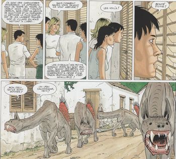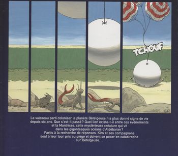 remarques: | l'aventure continue pour Kim Keller qui débarque sur Betelgeuse et qui va de surprise en surprise la capsule de la navette atterrit sur Bétel-Six dans une situation scabreuse parmi la végétation bételgeusienne et Wong, le chef de l'expédition est déjà tué par un drôle de monstre, hiérarchiquement c'est alors Kim qui le remplace >> p. 12/13 discussion sur la musique et le jazz alors que des iums rodent autour de la capsule les 4 survivants décident maintenant d'explorer les environs avec un aérojeep muni d'un impulseur centrifuge (>> voir description dernière page) >> p. 15 ils découvrent les beautés de la faune bételgeuse >> p. 17 Kim a une approche très humaine envers les animaux arrivés au village du clan Donovan où ils apprennent que l'ordinateur du "Konstantin Tsiolkowsky" a été infecté par un virus informatique et que les communications avec Aldébaran et avec la Terre ont été interrompues Donovan accuse le clan Leilah d'avoir saboté cet ordinateur mais pour quelle raison le clan Leilah aurait-il commis cette action? >> p. 21 l'histoire des survivants du "Tsiolkowsky", 55 occupants du vaisseau dont Donovan et Leilah, le commandant, étaient parti en reconnaissance sur Bétel-Six et peu après l'ordinateur, sans raison apparente, a été infecté interrompant toutes les communications externes par la suite, le groupe a rencontré les iums qu'ils ont pris pour des animaux doués d'une certaine intelligence, Leilah leur a reconnu une intelligence semblable aux humains mais Donovan continua de les traiter comme des animaux d'où rupture et division des survivants entre le clan Donovan et le clan Leilah n.b. les conséquences: si les iums sont considérés comme des êtres semblables aux humains, la colonisation de Bétel-Six par la Terre devra être interrompue selon la charte de l'ONU sur la conquête spatiale d'où le désaccord entre les deux clans >> p. 23 réapparition des ballons-plantes qui absorbent l'énergie de l'atmosphère mais dont on ne peut expliquer ni le comportement ni l'utilisation, ils offrent toutefois un spectacle intéressant >> p. 29 discussion sur le rôle de la femme dans la société moderne et dans une société archaïque un ium réussit à délivrer Maïlan rétenue prisonnière par le clan Donovan, Kim veut la retrouver mais leur aérojeep et leurs armes sont réquisitionnés par le colonel Donovan >> p. 34/35 la bande d'affreux (genre de hyènes géantes) qui traversent la colonie Donovan et qui sont mis en fuite par un petit ourson apprivoisé mais très féroce par la suite le quatuor réussira à récupérer leur aerojeep et à rejoindre le camp du clan Leilah alors que sur Aldébaran, Alexa et Marc se retrouvent et planifient une expédition pour retrouver Kim et son équipage dont on est sans nouvelle au clan Leilah, la rencontre est amicale et Kim décide d'organiser une expédition avec l'aerojeep pour étudier les iums pendant qu'une autre équipe cherchera à dépanner l'ordinateur central dernière page: le principe de fonctionnement pour un impulseur centrifuge, assez bien imaginé mais peu plausible >> c'est l'aventure aldebarane à la sauce bételgeuse, le récit reste intéressant mais la trame se développe lentement parmi des interludes sexuelles, intellectuelles et philosophiques |