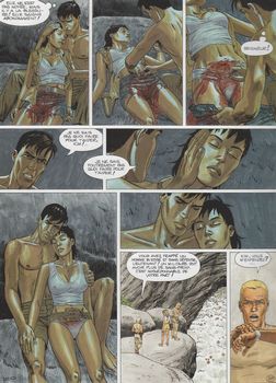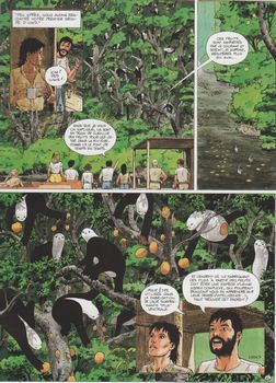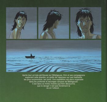 remarques: | début de l'album: Kim qui enregistre sur dictaphone les préparations pour l'expédition >> p. 3 l'étude sur les iums qui n'ont ni bouche, ni appareil digestif mais une pile énergétique interchangeable à l'intérieur du bas-ventre, les seules choses qu'ils doivent effectuer, c'est de respirer et de boire et si les iums sont considérés comme des êtres intelligents semblables aux humains, la colonisation de Bétel-Six doit être annulée selon la charte del'ONU l'expédition s'effectue avec Kim, Hudson, Inge et Hector + deux membres de chaque clan dont Donovan avec Dixon et Leilah avec Toshiro >> p. 11 une discussion d'amour propre une caverne construite par les iums est explorée, on y découvre des traces de construction évoluée et de peinture, de plus les iums connaissent le feu et récoltent des fruits qu'ils jettent dans la rivière pour une destination inconnue >> p. 22 malgré des conditions rudimentaires, le lavage des dents est de rigueur >> p. 23 retrouvaille avec Maïlan, l'histoire et l'origine de Maïlan >> p. 24 des animaux étranges dont un poisson-dirigeable >> p. 25 une Kim très malpolie, bordel de merde! >> p. 28/29 rencontre de Kim avec une nouvelle mantrisse qui devrait avoir des contacts avec les iums >> p. 31 l'arrivée au barrage où les fruits des iums sont arrêtés et canalisés dans une grotte souterraine lors d'une dispute avec Dixon, Kim est blessée au bas-ventre et tombe dans l'eau, Hector se porte à son secours et tous deux sont engloutis dans la grotte souterraine entretemps, Marc, Alexa et Padewsky s'emparent d'un astronef pour rejoindre la galaxie Bételgeuse alors que l'expédition retourne à sa base en abandonnant temporairement Kim et Hector à leur sort >> l'action se précise, le développement devient captivant avec un bon graphisme et un environnement mystérieux |