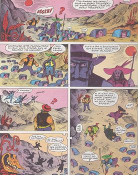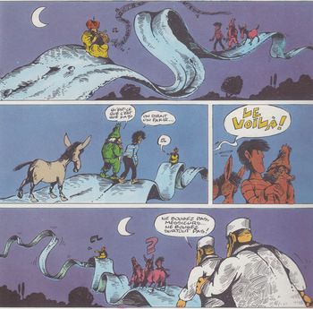 remarques: | Barthélémy cherche toujours à retourner sur le A et oncle Félicien lui prépare un passage par la fermeture à glissière, mais accidentellement, c'est Hector qui est entraîné dans le passage >> p. 7 apparition de la femme d'Hector et mère de Philémon (pour la première et dernière fois) n.b. on ne peut pas utiliser deux fois le même passage pour se rendre sur l'île du A Hector arrive alors sur l'île des souffleurs avec le berger-régisseur = gardien des souffleurs, Félicien envoie Philémon via une cage à souffleur rechercher Hector, mais tous deux sont capturés par des chasseurs de souffleurs = comédiens barbares >> p. 20 la tactique de défense des souffleurs (autant en emporte le souffle) n.b. un comédien sans souffleur devient vite un ringard famélique = un comédien raté Hector et Philémon sont emportés sur le vaisseau-théâtre qui est cerné durant son voyage par les criticakouatiques qui demandent à l'équipage une représentation théâtrale à critiquer, celle-ci ne leur convenant pas, les criticakouatiques coulent le vaisseau-théâtre >> p. 28 l'allégorie des criticakouatiques: "pour un criticakouatique de l'Atlantique, cette pièce antique est rachitique, hérétique, pas pathétique, ni athlétique, trop poétique, systématique, allégorique et dogmatique ainsi qu'énigmatique, c'ést du toc et retour à la maison via le théâtre des criticakouatiques (qui se donnent à eux-mêmes des représentations) et via la porte de sortie du théâtre, retour chez oncle Félicien + deux épisodes supplémentaires: a) le chapeau magique qui ne donne pas satisfaction au magicien >> p. 37 Philémon aime les étranges choses presque autant que les choses étranges b) la route dans les airs animée par le fakir-fou, le charmeur de routes >> un très bon album, bon scénario avec de superbes allégories, rhétoriques et autres jeux de mots et avec le monde du théâtre comme décor ainsi que toujours un magnifique graphisme/coloriage |