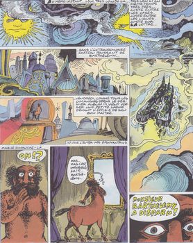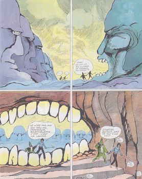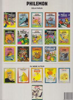 remarques: | le peintre qui peint la nuit et qui n'arrive pas à peindre ce qu'il veut, car le personnage de Barthélémy apparaît chaque fois sur sa toile > p. 9 on se rappelle que Barthélémy est resté sur le A comme image encadrée entretemps sur le A, Barthélémy disparaît du cadre et c'est Philémon qui apparait à sa place et qui sort aussi du cadre >> p. 14 une belle case du A Philémon repère le peintre sur le A, mais un mystérieux personnage (un démon de 3ème catégorie) recherche également le peintre qui fait maintenant disparaître les gens et les décors en les peignant poursuivis par la couleur de la peinture du peintre, Philémon et Vendredi réussissent à lui échapper >> p. 21 Vendredi qui confond des cochonneries de peinture avec le numéro de la page l'histoire du peintre qui avait vendu son âme au démon contre le don d'être un artiste de la peinture, mais le peintre avait reçu encore beaucoup plus, il avait aussi reçu le don de donner la vie à sa peinture, toutefois, il n'avait pas honoré le contrat fait avec le démon, c'est pourquoi celui-ci le pourchasse pour lui faire honorer son contrat le peintre réussit à peindre le démon qui se retrouve sur la toile à la place de Barthélémy qui, lui, revient à la vie, mais le démon a laissé à Barthélémy et à Philémon sa canne magique >> p. 33 et comme le démon n'a pas réussi à faire honorer son contrat, Belzébuth, son maître, apparaît et comme punition envoie le démon au paradis toujours poursuivis par le peintre, mais guidés par la canne magique, Philémon et Barthélémy rencontrent à nouveau Belzébuth et son démon de 3ème catégorie (cette fois peints en bleu) qui retournent en enfer après avoir négocié un compromis avec le peintre, Barthélémy et Philémon réussiront à regagner le monde du réel grâce au peintre du monde des lettres qui fait leur portrait qui se transmet sur la toile du peintre du monde réel ouf! c'est fini avec ces peintures du diable, ces diables de peinture, ces peintures endiablées ou diablement peintes >> diablement et démoniaquement développé cet album et le lecteur reste un pauvre diable devant tant de diablerie, le scénario est quelque peu tiré par la queue du diable mais reste du typiquement Fred toujours bien raconté et bien amusant pour ce dernier album avec un graphisme bien peint n.b. - ce dernier album de la série Philémon est d'un format légèrement plus grand que les albums précédents, comporte 62 pages au lieu de 48 avec des pages de garde différentes et un 4ème plat qui présente les albums des rééditions avec partiellement des couvertures d'albums redessinées (Philémon deuxième série débutée en 2003) - préface et résumé bref des aventures précédentes de Philémon et de Barthélémy par le hérisson que l'âne Anatole prend toujours pour un chardon - le titre est "le diable du peintre" mais pourrait aussi être "le peintre du diable" |