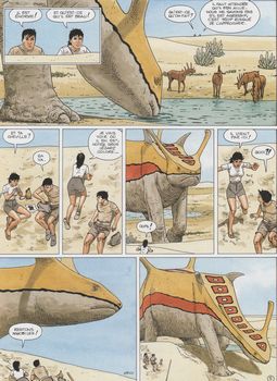 remarques: | dernier album du IIème cycle, album surtout explicatif tandis que Maïlan voit ses cheveux pousser et ses seins s'agrandir grâce à la gélule, Hector tombe amoureux de Kim (sic!) >> p. 7 la rencontre avec le lézard géant coloré Maïlan qui aime Hector vient alors jalouse de Kim une belle nuit bételgeusienne, Kim est appelée par une deuxième mantrisse vivant sur Bételgeuse, transportée par un ium, Kim est sauvée de la mantrisse par un homme extra-terrestre il se fait que celui-ci est arrivé sur Aldébaran avec les mantrisses qu'il connait bien et vit en bonne compagnie avec elles il a enquêté sur Kim, l'observant depuis Aldébaran et finalement s'est senti attiré par elle, toutefois il appartient à une peuple d'un degré d'intelligence supérieure aux terriens que son peuple trouve trop agressifs et il lui était interdit de prendre contact avec les terriens mais il a fait de son propre chef une exception avec Kim avec qui il fera l'amour mais qu'il devra quitter malgré tout car jugé trop pro-terrien il a été remplacé avant de partir, il fournira à Kim toutes les explications nécessaires sur les mantrisses qui proviennent de la même planète que l'extra-terrestre >> p. 23 les mantrisses choisissent les humains les plus généreux et les plus intelligents à qui elles distribuent leurs fameuses gélules qui améliorent de beaucoup la santé et la longévité des humains tout en leur fournissant une certaine ascendance sur les autres humains >> p. 24-26 autres explications sur les mantrisses, notamment leur pouvoir de communication interstellaire et leurs bons rapports avec les iums >> p. 27 Kim réussit aussi à communiquer avec la première mantrisse, celle de la caverne et après avoir quitté l'extra-terrestre, Kim retrouve tout l'équipe de Bételgeuse ainsi que Marc, Alexa et Padewsky fraîchement arrivés Kim leur explique que ce sont les mantrisses qui ont saboté les ordinateurs du "Konstantin Tsiolowsky" (les mantrisses voulaient d'abord éliminer tous les humains sur Bételgeuse car elles ne voulaient pas de leur colonisation mais elles se sont rendus compte qu'il y avait parmi les humains certains spécimens de bonne et grande qualité) et elles n'ont voulu que les isoler Kim a réussi à convaincre les mantrisses de rétablir les communications contre la promesse de ne pas coloniser Bételgeuse mais d'y garder uniquement une mission à titre d'ambassade >> p. 41 l'apothéose finale: la démonstration de la technique de communication par les plantes-ballons et la finale en happy-end, Marc aime Inge, Maïlan aime Hector, Hector aime Kim mais se résoud à l'abandonner pour Maïlan, Kim se réconforte avec Alexa tout en regrettant son bel extra-terrestre >> p. 44 Inge et ses gros seins >> fin sulfureuse du 2ème cycle, un récit toujours assez captivant bien que tournant un peu à l'eau de rose toutefois lex explications concernant les mantrisses sont intéressantes et bien imaginées ces deux premiers cycles resteront les meilleurs du genre pour cette saga futuriste liée à la colonisation de nouvelles planètes et bien élaborée entièrement par Leo qui fait preuve, malgré l'aspect classique et familier du récit, d'une imagination débordante |