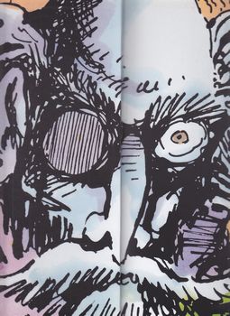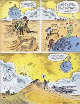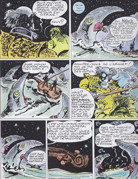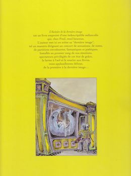 remarques: | discussions dans un bistro sur l'utilité de l'enseigne "à la dernière image" d'une boutique dans le village, boutique dont la vitrine est vide et où on ne vend rien durant une partie de billard, un joueur reçoit une boule à la tête et est considéré comme mort, ses compagnons décident de le déposer dans la vitrine vide de la boutique qui est aussi vide et dont la porte n'est pas fermée après coup, le pseudo-mort ressuscite et devient l'invité du propriétaire de la boutique vide qui est un grand violoniste >> p. 15 le baron tzigane qui construit ses décors avec son violon et le baron à chaque fois qu'il joue change son décor le duo se retrouvant alors naviguant sur un océan d'eau >> p. 20 on dérive sur l'eau avec un violon-radeau et selon les explications du baron tzigane, la dernière image serait celle qu'on voit juste avant la mort >> p. 23 apparition de la lune conteuse (voir l'album précédent) en parlant commerce, les deux compères attirent des requins-cigares (= des banquiers) = les plus dangereux des requins d'affaires, entretemps le violon-radeau navigue sur le sable d'un désert >> p. 36 le soleil avec des lunettes de soleil (ce ne sont pas des lunettes de soleil, ce sont les lunettes du soleil) >> p. 42/43 apparition du petit prince (n.b. il fallait s'y attendre) finalement grâce à des coups d'archet sur le violon-radeau qui a rétréci au soleil, on réussit à retourner à la boutique et la dernière représentation se déroule en la présence d'un boucher qui aimerait avoir la dernière image de son cochon préféré >> pour son dernier album ou sa dernière image, Fred n'aura pas vraiment laissé une bonne image derrière lui, un album au scénario pratiquement nul, on touche ici au comble de l'absurde (voir même de l'idiotie) sans aucune saveur et le graphisme devient aussi un peu trop grossier, c'est dans la série, l'album de trop qui fait déborder le vase loufoque |