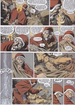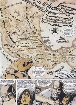 remarques: | série Quetzalcoatl (prononcez: couétzal-coateul) sur la conquête espagnole de l'empire aztèque 1525, avant d'être suppliciée, Maiana, jeune Indienne de vingt ans, se confesse au padre Enrico Segura: jeune mixtèque, elle a échappé cinq ans plus tot au sacrifice qui a couté la vie à son fiancé, après bien des aventures, elle deviendra la maîtresse de l'empereur aztèque Montezuma, puis la putain officiel du commandant espagnol Hernan Cortès, le destin tragique de Maiana, appelée deux fleurs de mais, est le thème de cette série au titre évocateur 1525, mission de Vera Cruz, Mexique; arrivée de deux religieux de l'Inquisition: padre Segura et frère Tancrède, pour interroger une pécheresse mixtèque qui prétend avoir été la femme de Cortez >> p. 13 le cacahuatl de frère Antonino >> p. 15 les instruments de pénitence sur la pécheresse, interrogatoire de Maïana Xochitla, originaire de Oaxaca (= mimosa) au Mixteca début de l'histoire de Maïana la civilisation aztèque/mixtèque qui ne connaissait pas la roue ni les chevaux, mais l'astronomie, le maïs, le piment, les courges, les tomates, les carottes, le chocolat et l'alcool de mescal >> p. 22 la carte de Cem Anahuac = l'empire aztèque = le Mexique actuel connaissance avec le dieu Quetzalcoatl qui annonce son retour sous la forme d'un serpent à plumes >> p. 32 le tepuli dans le tipili >> p. 36 sacrifice humain et cannibalisme >> p. 39 Mochica = messager de Quetzalcoatl qui annonce la mort, en l'occurence une expédition guerrière (la guerre fleurie) des aztèques de Tenochtitlan = capitale aztèque Maïana est amenée en captivité à Tenochtitlan par le chef de l'expédition: Quani colotl = scorpion rouge = général de l'empereur Moctezuma >> esquisse d'une histoire aztèque dans le style de Vae Victis, sang et sexe à Mexico, récit peu convaincant, mais bon graphisme avec un point intéressant: les pages de garde constituées en lexique du langage aztèque = langage nahuatl (prononcez naouateul) avec comme exemples: - azteca = peuple du nord, - mexica = peuple des lacs, - mixteca = peuple des nuages, - texcalteca = peuple de l'intérieur, - tolteca = peuple des dieux, - zapoteca = peuple fermé - quetzalcoatl = dieu de la végétation et de la philosophie = serpent à plumes - coatl = serpent - oaxaca = mimosa, - axa = visage, - mochica = messager, - tehuan (prononcez teruan) = puma, - zopilotl = vautour - ce = 1, ome = 2, yei = 3, oca = 4, chica = 5 Information Quetzalcóatl1 (littéralement "quetzal-serpent", c'est-à-dire "serpent à plumes de quetzal" en nahuatl), est le nom donné, dans le centre du Mexique, à l'une des incarnations du serpent à plumes, qui était une des principales divinités pan-mésoaméricaines, au Mexique central, il est connu à l'époque postclassique sous la forme de Ehecatl-Quetzalcóatl annexes - couvertures 1er et 4ème plat - carte de l'empire aztèque - esquisses du dieu Quetzalcoatl |