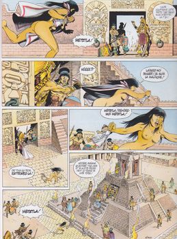 remarques: | la peur du retour de Quetzalcoatl hante l'empereur Moctezuma alors qu'à Vera Cruz, la rebellion est réprimée, Maïana essaie d'apaiser les craintes de Moctezuma >> p. 7 la légende de Quetzalcoatl on rapporte maintenant que Quetzalcoatl aurait été vu à 60 km au sud de Vera Cruz, monté sur un cerf géant et crachant des éclairs >> p. 11 la pratique de la pipe au sexe était interdit chez les aztèques à Vera Cruz, Maïana informe padre Segura de l'apparition d'une xocomexochitla = étoile filante = comète en 1519 à Tenochtitlan, cela serait une ultime malédiction et la dernière peur de Moctezuma et du peuple aztèque >> p. 24 nouveaux sacrifices humains au dieu le plus puissant des dieux aztèques: Huitzilopochtli = dieu majeur du soleil tout-puissant pour arrêter xocomexochitla et pour apaiser la colère de Quetzalcoatl, Moctezuma et Culhu font écorcher Metzla, la compagne bien-aimée de Maïana la comète a disparu, Moctezuma revit et croit que cela est dû au sacrifice sur Metzla, pour se faire pardonner de Maïana, il veut la faire impératrice mais celle-ci ne pense plus qu'à se venger, elle mutile grièvement le sexe de l'empereur et s'enfuit vers l'est avec l'aide de l'intendante de Chilome Tenoch pour y rencontrer Quetzalcoatl, le dieu des Caraïbes, le serpent à plumes afin que celui-ci l'aide à se venger des aztèques alors que Cuauhtemoc, frère de Moctezuma veut profiter de la situation pour prendre le pouvoir, mais n'y arrive pas Maïana est maintenant en route vers Tlaxcala avec deux mochicas = messagers, mais ils sont poursuivis par des guerriers de Moctezuma qui doivent lui ramener le coeur de Maïana >> le récit est un peu plus étoffé que le précédent et le graphisme se maintient correctement, l'auteur en profite pour prendre la défense des aztèques qui eux vivaient dans l'ignorance alors que l'Inquisition agissait hypocritement, sévère réquisitoire par l'auteur contre l'Eglise dans les premières pages |