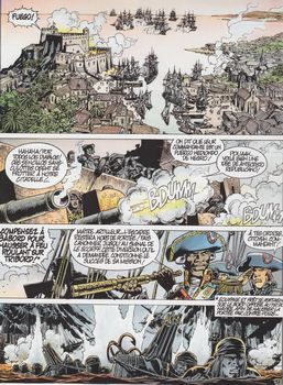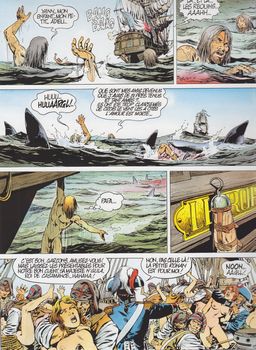 remarques: | St-Malo, 1793, époque post-révolutionnaire Kerbeuf est devenu commissaire de la République, Le Scorff passe en cour martial et est condamné à être exilé en Amérique avec d'autres aristocrates dont sa fiancée Locmaria et ses parents (en fait ils partent pour l'Afrique où ils sont destinés à être échangés chez un roi nègre contre du bois d'ébène = des esclaves noirs pour les Amériques) >> p. 8 le travail de la guillotine >> p. 11/12 le mariage de Le Scorff avec Locmaria, institué par leur persécuteur Le Guenn sur la route des esclaves les aristocrates sont noyés, mais Locmaria reste l'esclave de Le Guenn alors que Le Scorff réussit à s'échapper du vaisseau et à rejoindre les côtes africaines où il est secouru par la négrisse Assomption, fille de chef et Le Scorff devient le dieu cacatois de par son crochet à sa main dextre combat contre les esclavagistes, puis arrivée du capitaine noir Toussaint-Louverture qui réhabilite Le Scorff et le nomme capitaine de vaisseau, combats à St-Domingue contre Kerbeuf, mais celui-ci échappe à Le Scorff qui le poursuit jusqu'à St-Malo, par la même occasion Le Scorff transporte la citoyenne Beauharnais (à qui il sauve la vie durant le voyage) qui est attendue à St-Malo par Bonaparte, mais arrivé à St-Malo, Le Scorff est arrêté par Kerbeuf, devenu entretemps préfet de la République >> un album très moyen, graphisme et scénario moins élaborés que le premier album, pages de garde contenant la deuxière carte au trésor |