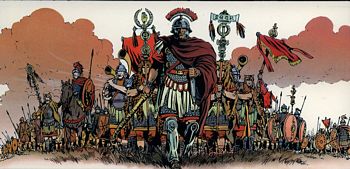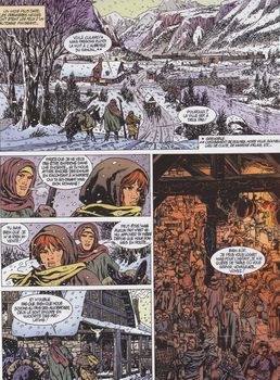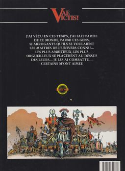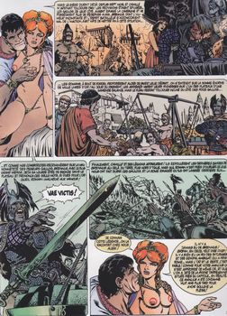 remarques: | 59 Av.JC à Rome, des orgies romaines sont célébrées avec César, Pompée et Crassus, mais Crassus a prévu de supprimer les esclaves-artistes pour ne pas laisser de témoins, Ambre, une jeune esclave celte réussira à y échapper grâce à l'intervention inopinée de César >> p. 10/11 l'histoire du chef gaulois Brennus "vae victis" lors de sa fuite, Ambre est secourue par Milon, le druide d'origine étrusque, tous deux prennent le chemin de la Bretagne via la Gaule Chevelue (Aquitaine, Celtique et Belgique) péripéties à Cularo (Grenoble), rencontre avec Cloduar, le géant allobroge = un ambact = garde du corps à qui on confie Ambre pour la conduire au camp romain de Segusium, mais sur son chemin, Cloduar est attaqué par la bande de Garak, le voleur, qui s'empare d'Ambre et qui après coup s'empare aussi du chariot de Marcellus Didius, homme de main de Crassus, chariot qui est chargé d'or pour soutenir les efforts des Helvètes ou des Germains contre César >> p. 24/25 la danse folle de Milon >> p. 37 l'attaque du chariot chargé d'or par la suite, Marcellus Didius et son capitaine seront capturés par les Germains de Arioviste et se mettront à son service, tandis que César prépare sa campagne contre les Helvètes >> p. 44/45 l'histoire des Helvètes qui veulent quitter leur pays >> on en est au début, mais déjà la série est bien amorcée avec un scénario et un graphisme respectables sur fond historique n.b. petit lexique gaulois - la Gaule chevelue (Aquitaine, Celtique et Belgique), - les gaulois chevelus = les gaulois non romanisés - les gaulois sont Celtes, le nom gaulois qui leur a été donné par les romains vient de Galatie (où certains gaulois s'étaient établis)= galates d'où gaulois - Ambre est une Celte de Bretagne, de son vrai nom Boadicae - un ambact = garde du corps d'un chef gaulois - vergobret = genre de préfet gaulois - torques = bijoux gaulois en or portés autour du cou ou du poignet Information Vae Victis est une bande-dessinée de Simon Rocca (scénario) et Jean-Yves Mitton (graphisme) en 15 tomes aux éditions Soleil l'histoire raconte la vie d'Ambre, une jeune esclave Celte de Rome, durant la période de la guerre des Gaules, revisitant l'histoire de la conquête romaine, le scénario montre Ambre aux côtés des plus grands de son temps, Jules César, Pompée, Vercingétorix et prenant une part active aux évènements, géographiquement, l'histoire se déroule depuis Rome jusqu'à la Grande-Bretagne, avec toujours le même leitmotiv pour Ambre: arrêter la progression des Romains les personnages principaux - Ambre: jeune Celte devenue esclave sous les Romains, elle rompt le ban de sa servitude et retrouve la trace de ses origines en Bretagne où elle portait le nom de Boadicae, elle ne cessera d'inciter à la révolte les peuples sous le joug romain, au cours de son périple elle rencontrera beaucoup d'hommes qui tomberont amoureux d'elle, mais finira par tomber amoureuse de Milon malgré des suspicions qu'il soit un espion romain, elle aura une fille, à laquelle elle donnera son nom d'origine, Boadicée - Milon: guérisseur etrusque, il est romain de naissance, mais son amour pour Ambre le fait hésiter entre les deux camps, il aide Ambre à s'évader de Rome et la suit en Gaule, puis en Bretagne, il utilise ses connaissances sur Rome pour se faire aider de César, l'aidant en échange de services pour faciliter son périple, il a autrefois servi un autre grand homme de Rome: Pompée, en tant qu'espion en Espagne - Cloduar: guerrier Gaulois, lui aussi amoureux d'Ambre, sans le sou, il devient pendant un temps l'ambact (garde du corps) de Celtill avant de se mettre au service d'Ambre, c'est un guerrier redoutable de par sa force physique et de sa résistance impressionnantes, mais il n'est pas très malin et s'emporte facilement - Garak dit le Borgne: chef d'une bande de voleurs gaulois, il devient l'amant d'Ambre et le père de sa fille, - Caius Julius Cesar: général et homme politique romain, il désire conquérir la Gaule, puis la Bretagne pour assoir son pouvoir sur Rome, il rencontre Ambre avant de quitter Rome, mais il s'éprend d'elle jusqu'à en être obsédé et se laisser dominer par sa passion - Marcus Licinius Crassus: général et chef d'état romain, l'homme le plus riche de Rome, officiellement ami de César, mais complote dans son dos pour que ce dernier soit embourbé dans une longue et pénible guerre en Gaule, étant donné qu'il a intérêt à ce que César reste loin de Rome, ses fils servent dans l'armée de César, c'est dans sa demeure que l'histoire commence, lorsqu'il organise un banquet de mets somptueux et agrémentés de poussière d'or où il convie ses collègues triumvirs, César et Pompée - Marcellus Didius: intendant de Crassus, c'est lui qui achète Ambre pour qu'elle participe au banquet que son maître donne au début de l'histoire narrée par la série, il se rend en Gaule avec une forte cargaison d'or pour se mettre les Helvètes au service de Crassus, mais finit par faire alliance avec les Germains, il sera un adversaire récurrent pour Ambre et Milon auxquels il finit par vouer une haine obsessionnelle - Celtill: chef Gaulois, fils de l'ancien roi de Gergovie Celtillos, il n'a de cesse qu'il ne récupère son royaume perdu lorsque son oncle a dépossédé son père, il deviendra par la suite Vercingétorix et tentera de fédérer les peuples gaulois pour combattre César - Yorc: breton, il mène une petite troupe de bateleurs avec Petit-Homme et Beau-Visage, il tombera amoureux d'Ambre et l'aidera à retrouver son rang en Bretagne - Petit-Homme: bateleur avec Yorc et Beau-Visage, cet énorme breton n'a qu'un usage limité de la parole - Beau-Visage: bateleur avec Yorc et Petit-Homme, déteste rapidement Ambre qui représente pour lui la dislocation du groupe - Arulf: guerrier icénien, il tombera amoureux d'Ambre après que cette dernière l'aura vaincu en combat singulier, il l'aide