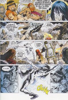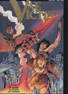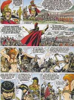 remarques: | après sa victoire sur les Helvètes, César commence à beaucoup s'intéresser à Ambre, mais toujours sous l'influence de Milon, il accepte de la laisser tranquille, dans la nuit, Garak, Ambre et quelques hommes s'échappent du camp romain, mais se font capturer un peu plus tard par les Germains d'Arioviste et de Marcellus Didius, ils sont torturés par les Germains tandis que Milon réunit la troupe de Celtill et Cloduar pour aller délivrer Ambre alors que César a une entrevue avec Arioviste pour mettre fin à ses incursions en Gaule >> p. 26/27 les tortures infligées à Garak et Ambre >> p. 37 l'entrevue entre César et Arioviste Milon et ses amis arrivent à libérer Ambre et Garak, Garak est tué en emportant Marcellus Didius dans sa mort, César repousse les Germains au-delà du Rhin et Milon accompagne Ambre qui veut retourner dans son pays la Bretagne en portant l'enfant de Garak dont elle était tombée amoureuse >> un album un peu moins historique et un peu plus à sensation, mais encore respectable n.b. les torques = bijoux gaulois, principalement en or |