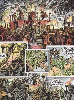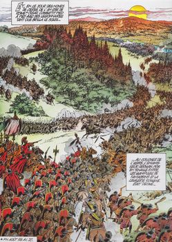 remarques: | 58 Av. JC, Milon et Ambre sont en route vers la Bretagne via le pays belgae, Ambre est enceinte de Garak le Borgne et veut accoucher en Bretagne alors que César avec ses alliés Celtill et Diviciacos viennent d'infliger une grande défaite aux germains de Arioviste Milon et Ambre arrivent dans un village bellovaque où se pratique encore des sacrifices humains sous l'égide du druide Cocillos, le sacrificateur >> p. 12 le chêne des druides >> p. 28 Milon utilise à nouveau ses pouvoirs magique (charmeur d'orages) pour dérouter le chef bellovaque Ambre n'est plus en état de voyager et doit rester au village bellovaque, mais pressentant un danger, Milon part chercher du secours chez les romains, un groupe réunissant Milon, Celtill, Cloduar et autres gaulois se mettent en route pour récupérer Ambre tandis que César à Rome demande des légions supplémentaires au Sénat romain Milon et ses amis réussiront-ils à sauver Ambre menacée par le sacrificateur? >> p. 44/45 la cérémonie bellovaque de la déesse-mère >> historiquement ce n'est peut'être pas toujours exact, mais le scenario est mené tambour battant avec beaucoup d'action et un graphisme bien développé avec une jolie couverture d'album avec en plus le thème des sacrifices humains pratiqués par certains druides gaulois |