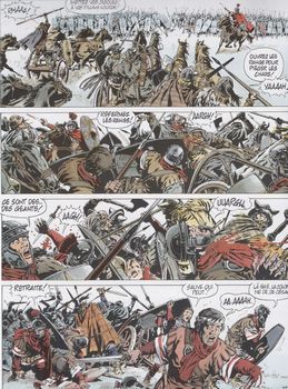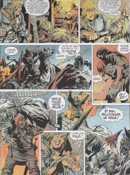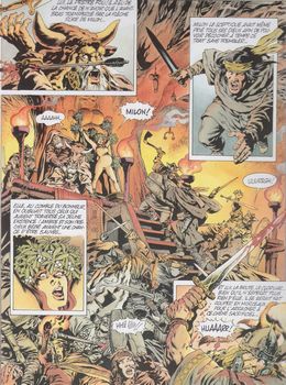 remarques: | Milon et ses compagnons ont réussi à délivrer Ambre du sacrifice de la déesse-mère et se réfugient dans une place fortifiée où ils sont assiégés par des bellovaques qui veulent récupérer leur druide Cocillos, le sacrificateur >> p. 8 l'accouchement d'Ambre qui se poursuit durant les combats pendant und dizaine de pages tandis que César a bien de la peine à battre les tribus belges, menées par leur leader Bodugnatos qui sera battu sur la rivière Sambre et qui devra se soumettre à César (mais de tous les peuples de la Gaule, les belges sont les plus courageux César dixit) après bien des difficultées, Ambre met au monde une fille qu'elle appelle Boadicae, après avoir repoussé les assauts de quelques guerriers bellovaques, Celtill part définitivement à la conquête de sa ville Gergovie, réapparition de Marcellus Didius qui se fait appeler maintenant Clocles-le-Borgne et qui dirige une bande de pillards germains, cherchant à se faire engager par César, Milon et Ambre en route pour la Bretagne rencontrent les germains de Didius, mais réussissent à leur échapper, toutefois la petite fille d'Ambre étant restée comme otage chez Didius, Milon fait fuir Ambre dans une chaloupe pour la Bretagne alors que lui reste sur le continent pour protéger la petite Boadicae junior >> un album quelque peu intermédiaire et à sensation, mais qui reste assez intéressant avec une action dynamique et un bon graphisme |