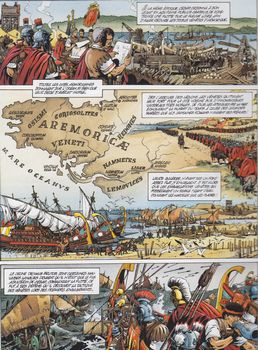 remarques: | Ambre, alias Boadicae, sur la route vers l'Icénie avec ses amis sont aidés par des Icéniens à sortir d'une mare de purin, duel compétitif entre Arulf, l'Icénien et Boadicae qui prouvera qu'une femme est aussi forte qu'un homme >> p. 5 Ambre dans la mare au canard par la suite, Boadicae et ses amis se dirigent vers le palais d'Algar où se trouve le roi Sligo, son oncle usurpateur, mais déjà par jalousie Beau-Visage cherche à la trahir alors que Yorc tombe amoureux d'elle entretemps, à Gergovie, Cloduar s'ennuie et demande à Celtill la permission de le quitter pour rechercher Ambre, sur son chemin vers le nord, il est capturé par une bande de germains et ne sera sauvé que par l'intervention inopinée de Milon commandité par César pour éliminer Clocles-le-Borgne, alias Marcellus Didius >> p. 29 une bonne têtée pour Cloduar Milon et Cloduar réussiront à empoisonner Didius et à s'embarquer sur une chaloupe pour la Bretagne poursuivis par des germains rendus furieux par la mort de leur chef de son côté, Boadicae a découvert sa vraie identité, elle est fille de chef, mais elle tombe dans les mains de Sligo alors que ses amis parviennent à quitter le palais d'Algar et avec Arulf, le jeune noble icénien qui a rallié le parti de Boadicae, nos amis cherchent à recruter des partisans pour destituer Sligo quant à César, il mène campagne contre les Vénètes avec son fils Decimus Brutus à la tête de la flotte romaine qui n'est pas encore de taille à affronter la flotte venète >> p.43 la superbe flotte venète, mais très dépendante du vent >> un album plutôt moyen autant pour le scénario que pour le graphisme, mais toujours encore intéressant |