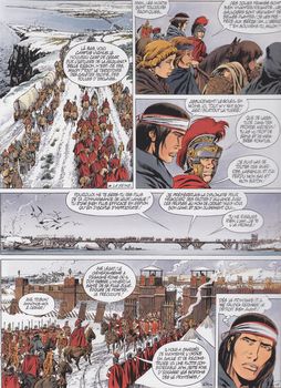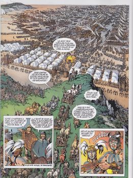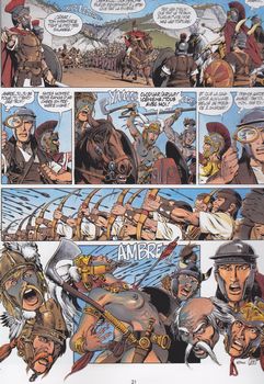 remarques: | Milon et Sligo, prisonniers de César, sont condamnés aux galères, chez les bretons, Cassivellaunos, roi des Casses, est élu chef de guerre entretemps, sur le chemin du retour, une partie de la flotte de César s'échoue sur des récifs et est attaquée par des Venètes, Milon est condamné au supplice du feu, mais sera sauvé par une contre-offensive terrestre menée par Labiénus, l'ami romain de Milon, alors que Sligo réussit de nouveau à s'échapper Milon est amené à Campus Vicinus où César a ordonné de construire une nouvelle flotte pour le printemps prochain et en l'an 54 B.C, César repart à la conquête de la Bretagne avec 800 navires, 5 légions et sa cavalerie >> p. 23 avant de partir, César exécute le chef héduen Dumnorix qui ne veut pas combattre ses frères de Bretagne >> p. 26 le camp de César à Cantium Promontorium (Ramsgate, au nord de Douvres) Boadicae ordonne une offensive générale contre les romains que Cassivellaunos a imprudemment laissé débarquer sans grande résistance, Boadicae est blessée durant l'offensive, Milon se porte à son secours, mais par serment il est obligé de retourner chez César, durant un second combat, Milon sera à son tour blessé par Sligo qui périra définitivement dans la bataille, mais Cassivellaunos y trouve aussi la mort >> p 25 la peinture de guerre des bretons: le pastel >> p. 34 l'opération chirurgical compliquée sur Boadicae pratiquée par Milon César ayant vaincu les bretons et reçu otages et butin, quitte la Bretagne en laissant des troupes d'occupation, Milon, amoureux de Boadicae, resp. Ambre, doit le suivre la rage au coeur tandis que Boadicae part se rétablir dans son palais d'Algar où elle décide de marier Arulf, l'Icénien, la conquête de Rome continue mais il semble que dès ce moment, César, qui est aussi quelque peu amoureux d'Ambre, devienne un conquérant brutal et sans scrupule >> un album dans la moyenne avec de bonnes scènes de bataille |
