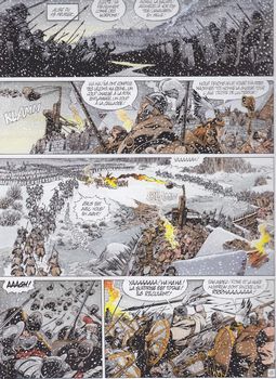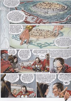 remarques: | 52 BC à Cenabum (Orléans), la garnison romaine est massacrée alors qu'à Rome Publius Clodius, allié de César est assassiné (peut'être par Pompée) et que Celtill à Agedincum (Sens) se prélasse sans rien entreprendre avec sa louve Adua, Boadicae le remet à l'ordre >> p. 10 Adua appellée la louve par Celtill rivalité entre Boadicae et Adua, à Rome, Pompée devient le maître de la cité et envoie César, accompagné de Milon, ramener l'ordre en Gaule en faisant alliance avec Lucterios, chef des Carduques, Boadicae est envoyée par Celtill dans le sud pour retarder l'arrivée des légions de César alors que Celtill part rallier les Bituriges et les Héduens à sa cause afin de faire façe aux légions de l'intérieur dirigées par Labiénus à Durocortorum (Reims) premiers succès de Boadicae contre les romains, mais César dirige en diversion ses légions vers Gergovie à travers les Cévennes pour ramener les troupes de Boadicae vers le nord, puis ne laissant que quelques troupes devant Gergovie, César repart pour le nord >> p. 22 l'or de César qui corromp les Héduens de Diviciacos après avoir calmé les Héduens, César lance ses troupes sur Cenabum (Orléans), tandis que Celtill piétine devant Gorgobina (Sancerre) >> p. 29 l'ordre de César pour Cenabum: tuez, brûlez, volez et violez prise de Cénabum, puis de Noviodunum enfin, malgré la tactique de la terre brûlée menée par Celtill, César assiège la forteresse de Avaricum (Bourges) bien protégée par des marais où Celtill a délégué Adua, sa louve avec 1000 guerriers >> p. 43 le plan d'attaque de César pour Avaricum en construisant un agger (= une rampe colossale pour y amener ses tours d'attaque) >> le graphisme est un peu moins élaboré, mais le scénario est intéressant et souligne l'aspect historique et militaire, notamment la stratégie de César dans la guerre des Gaules avec un César subtile et un Celtill manquant d'envergure, jolie couverture pour ce douzième album |